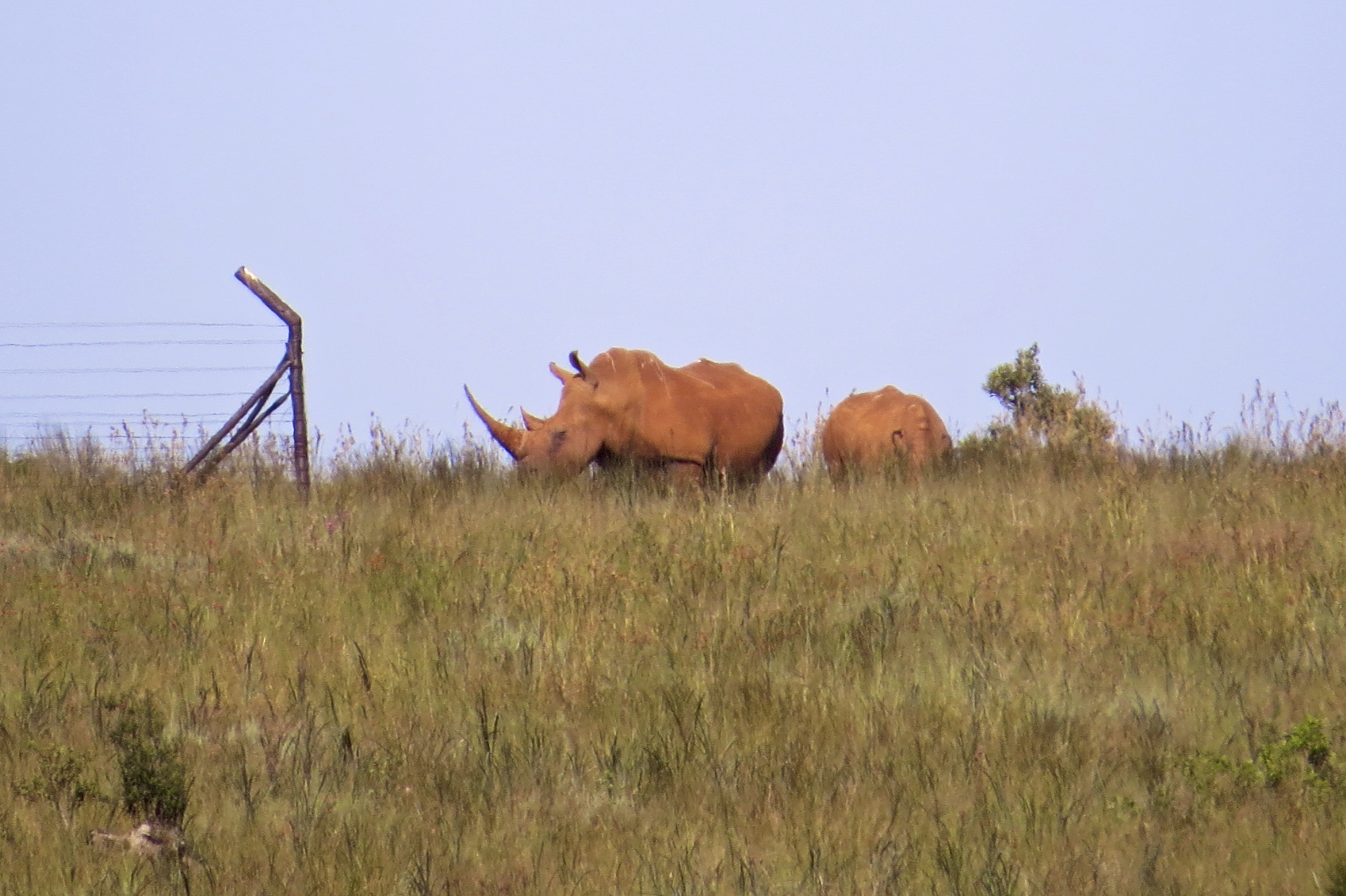 So we had seen the lions, and as this was called the Lion and Safari Reserve, where were the rhinos. To be fair to JP our ranger, he was determined to find them. Not an easy task in such a large area where they could be hiding anywhere. then as we had stopped to have a look at a herb of sable in distance, he found a pair of white rhino in the far distance on the crest of a hill. Luckily, the camera was up to the task, and we could see a mother and calf.