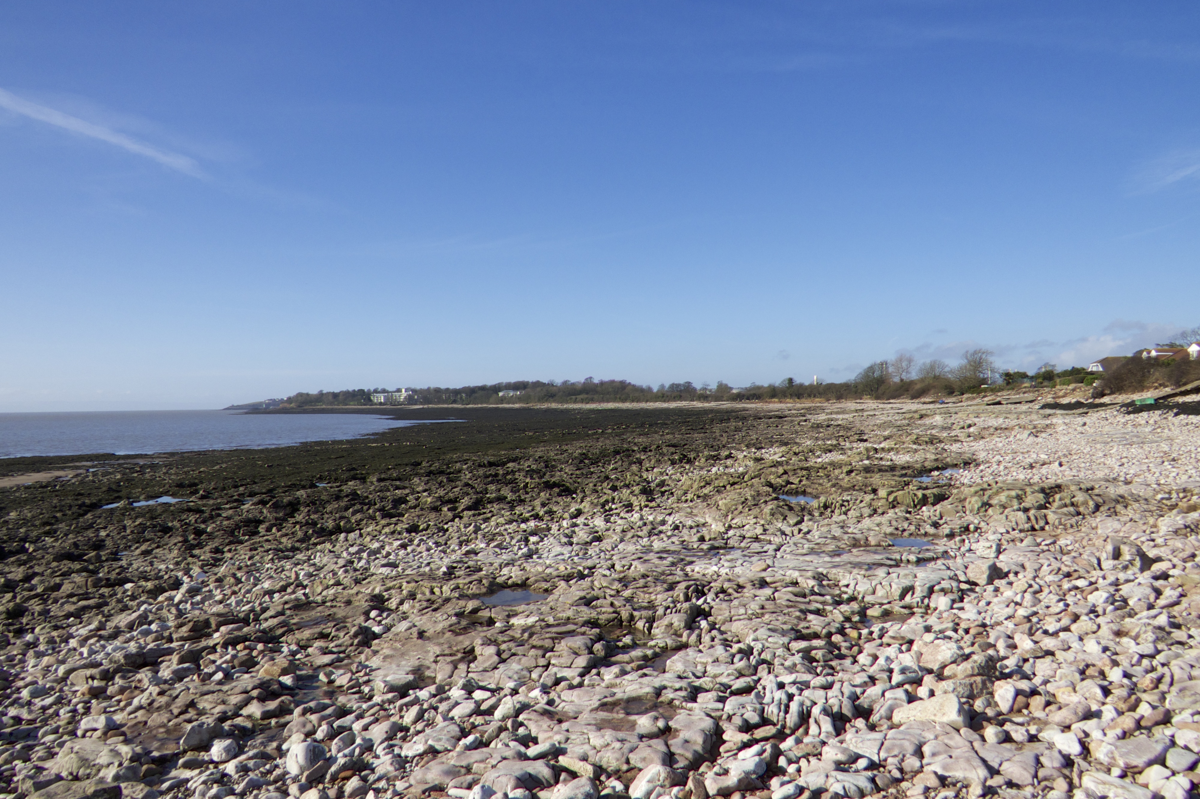The beach at Sully is long and wide when the tide is out. There is no sand, but is covered in stone and limestone. There is clear evidence of the how high the tides have been recently with the storms driving the sea water over the estuary banks and into the gardens lining the beach.