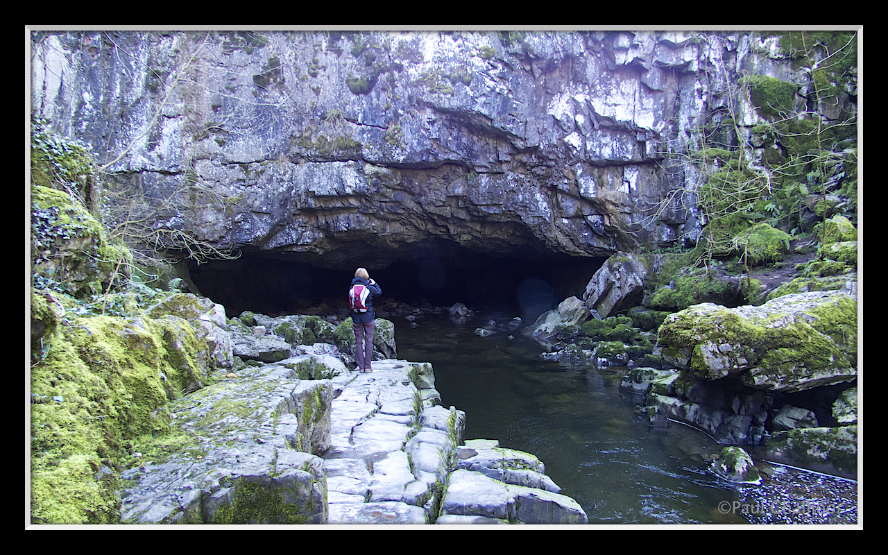 We started at the top of the Afon Mellte, which could be translated as the Lightning River, probably a reflection of how quickly the water rises in the river after rain. Parking in the car park near Porth yr Ogof I duly paid my £4 parking fee and we set off down the steep path to the river to see the entrance to the cave system. Porth yr Ogof is the largest cave entrance in Wales and one of the largest anywhere in the United Kingdom. It is nearly 20 m wide and some 3 m high. Aunty is dwarfed by the size of the cave entrance.
