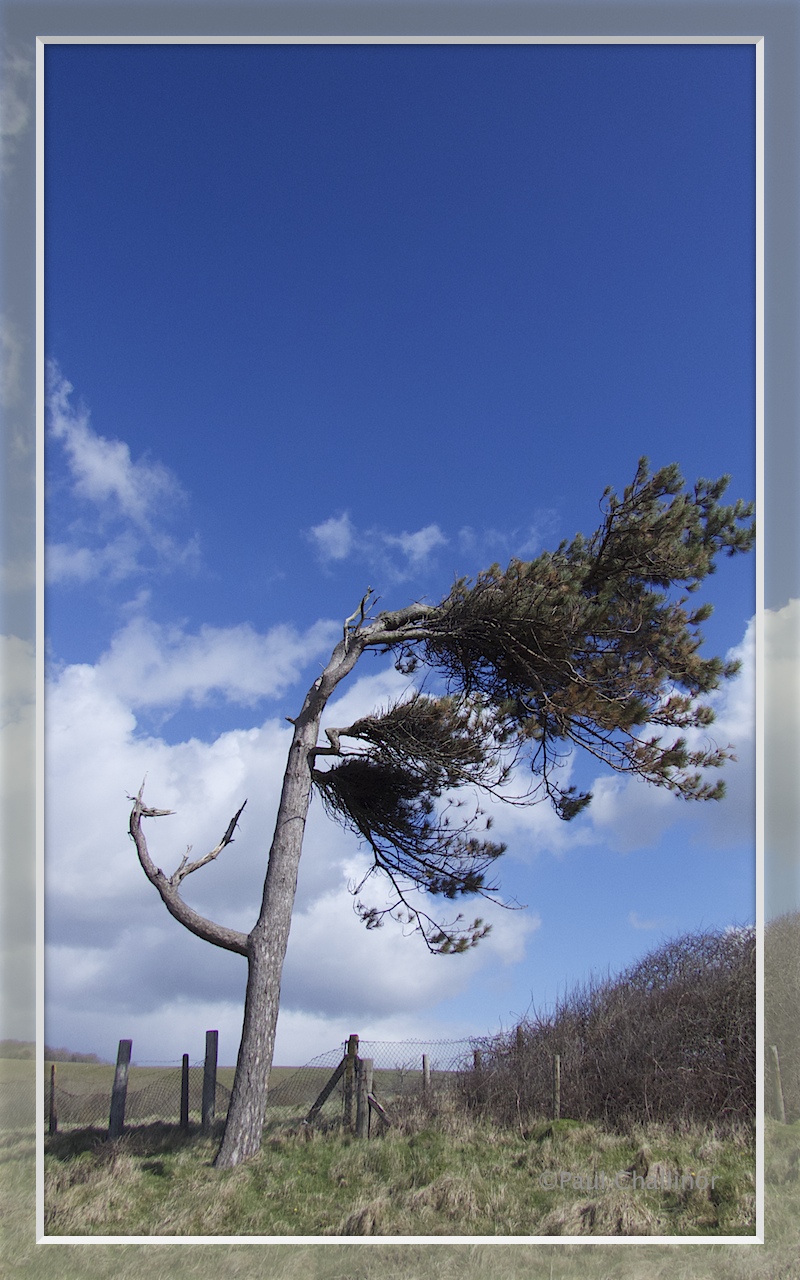 One of the sights that always fascinates me when walking near the coast is the way that the prevailing wind shapes and sculpts trees as they grow along the cliff edge. This pine has obviously seen better days, but is still hanging on determined to deny the wind it’s eventual victory.