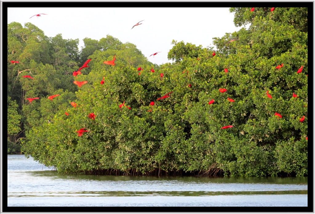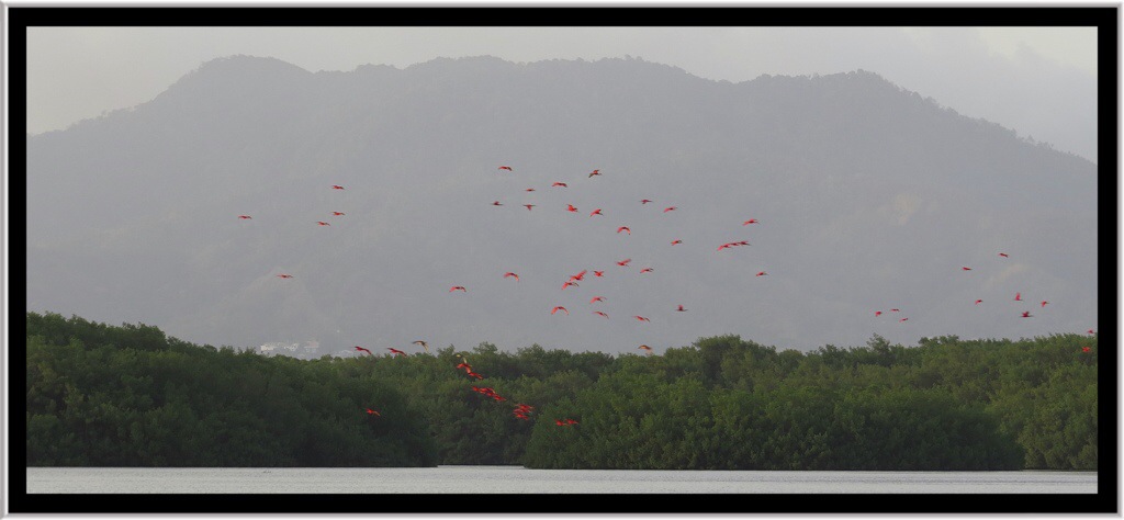 However the real delight of the trip was watching the Scarlet Ibis coming into roost at the end of the day. There is a single roost on an island in the swamp, and if the mangrove forest encroaches on this area they move roost. The current roost has been used for the past 5 years or so.