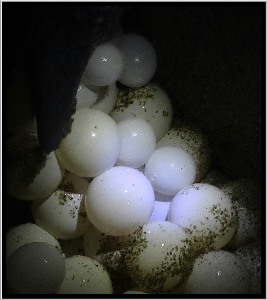 The first turtle we came across was just finishing digging her nest, taking very delicate and dexterous scopes of sand with alternate left and right back flipper. Then when she was satisfied it was deep enough, started laying her eggs. Each nest contains between 80-120 eggs, and she will come up onto the beach about 6-10 times over the next couple of weeks to nest again and again.