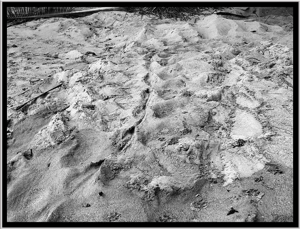 This morning when we woke up we noticed fresh turtle tracks on the beach immediately opposite the hotel. A turtle had nested on the beach here as well last night. The tide had washed most of here tracks away, but there were enough left to show where she had nested.