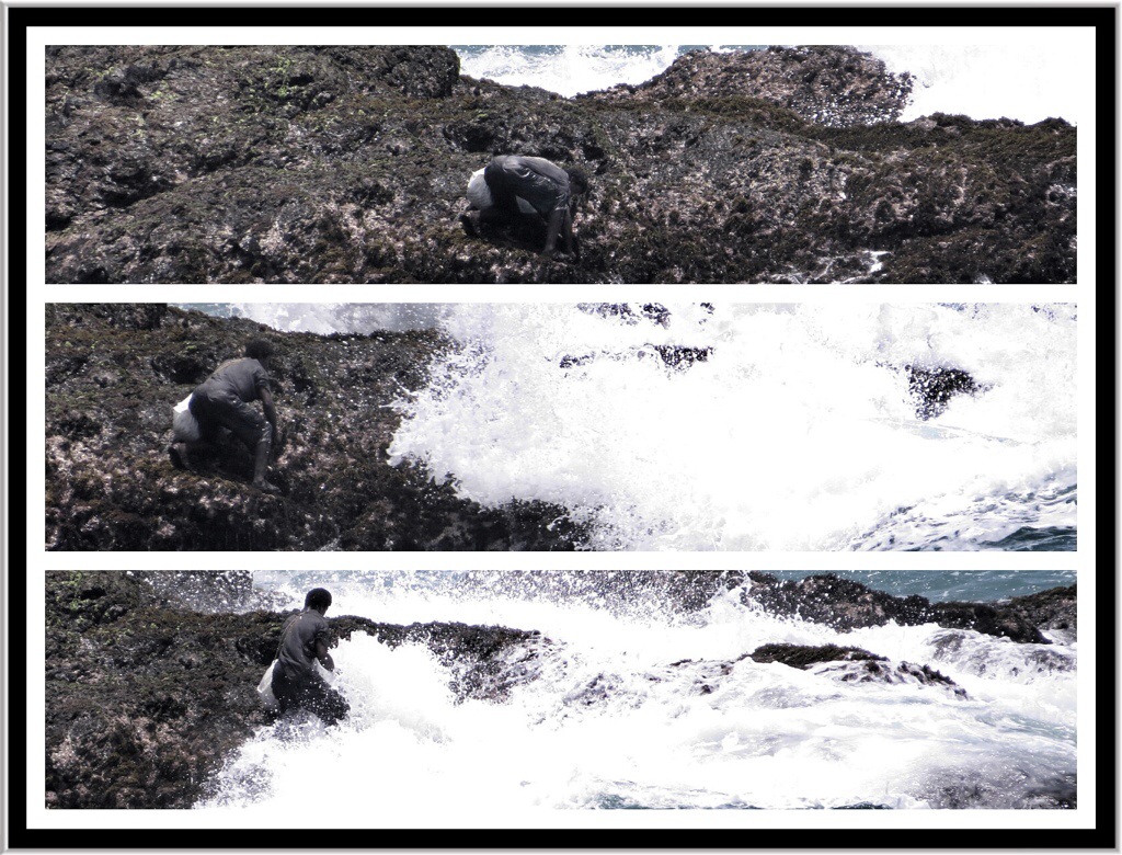 Mind you someone else almost didn’t have the opportunity to leave any footprints at all. We noticed a local clambering over the rooks collecting seaweed maybe. At one point he was caught off guard by a wave, but was still standing afterwards.