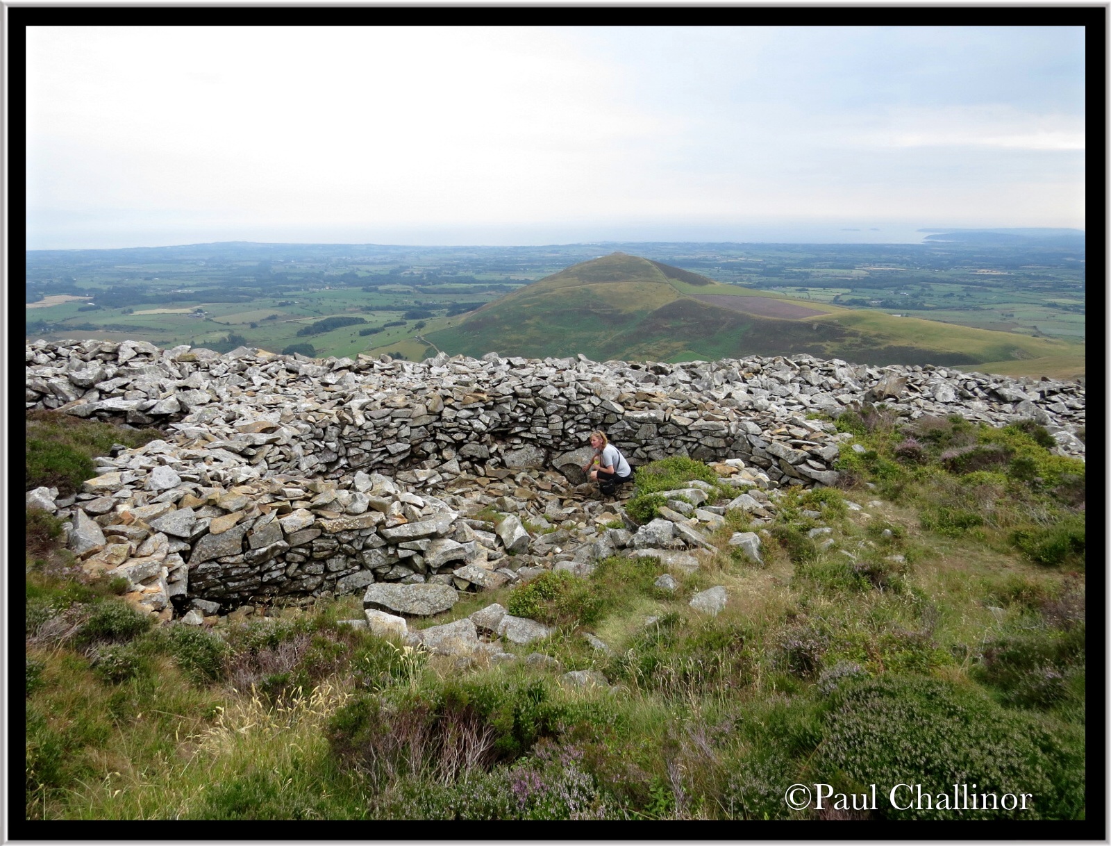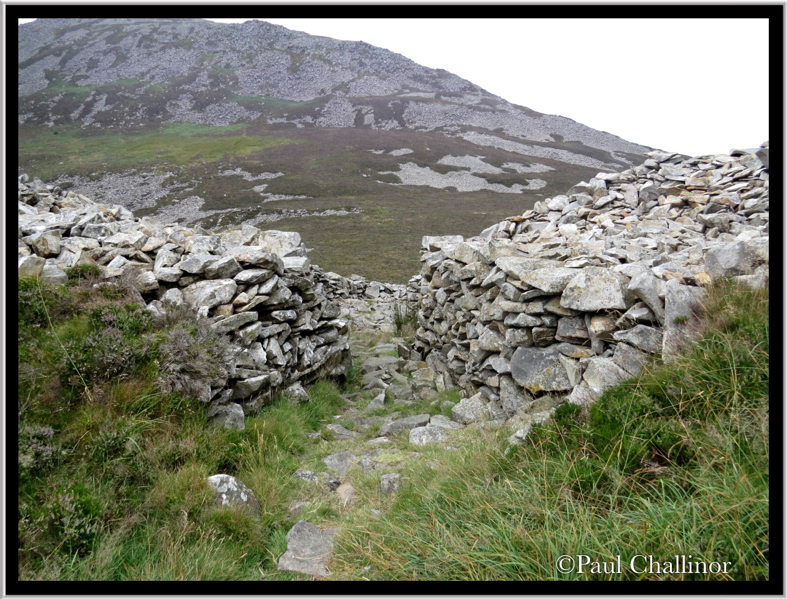 Part of the perimeter wall on the north side.The main hillfort is enclosed by a formidable single rampart which still stands up to 3.5m high in places. Where nearly intact, the top of the rampart still has its parapet walk reached via a number of sloping ramps from the interior. This wall is broken by two main gateways, both of which funnelled visitors through narrow, restrictive passages, as well as three ‘posterns’ or minor gateways, one of which at least was designed to allow inhabitants out down a narrow mountain path to gather water from a spring.