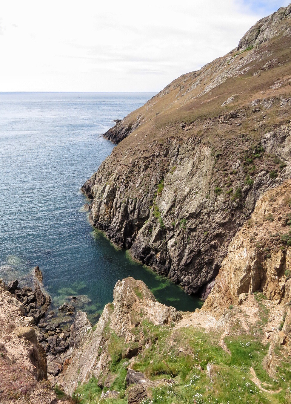 One place worthy on mention though is Porth y Pystill. All of a sudden we noticed an abandoned small port at the bottom of the cliffs, but couldn’t see any way down. At the top of hey he cliff is an old rusty winch and pulley wheel. Back at the caravan a little research turned up a brief history on a port and quarry that never really took off. Granite was quarried near by and shipped out via the small port. However, the quarry was difficult to access, workmen had to scramble down part way and then climb down ladders the rest of the way. The port had be continually cleared of rocks as the sea kept on bring them back to block access. No wonder it never worked.