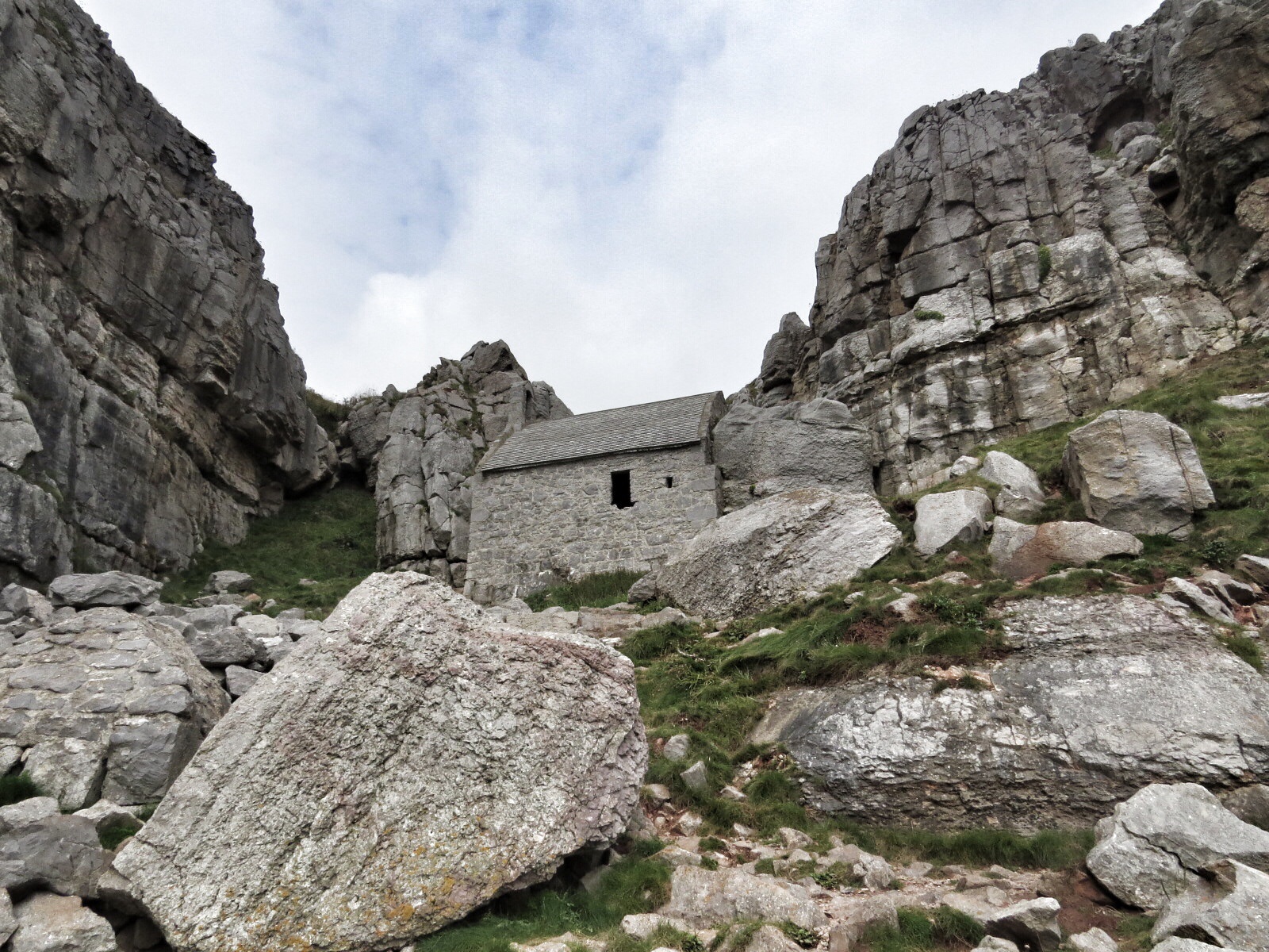 Why did he come to Pembrokeshire? He may have come to visit a Welsh Abbot, but we’ll never know. St Govan was already an elderly man when he came to Pembrokeshire, and tradition says that pirates from Lundy Island tried to capture him. Then as he was escaping the cleft opened up in the rocks giving him a place to hide, then it closed. The pirates couldn’t find him and moved on. Filled with a sense of shame for his cowardice, and not believing in the safety of his faith in God provided him, he decided to remain so that in future he might convert the pirates. Or possibly he was aware that the local people were much troubled by the marauding pirates and he decided to remain as a watchman, teacher and protector for them.