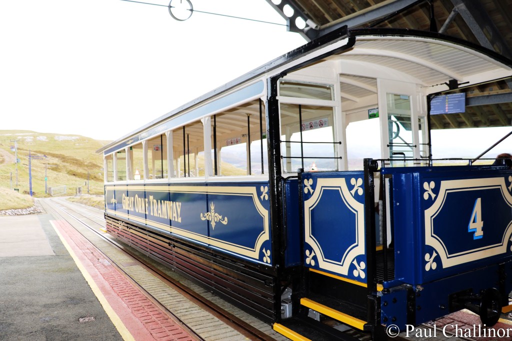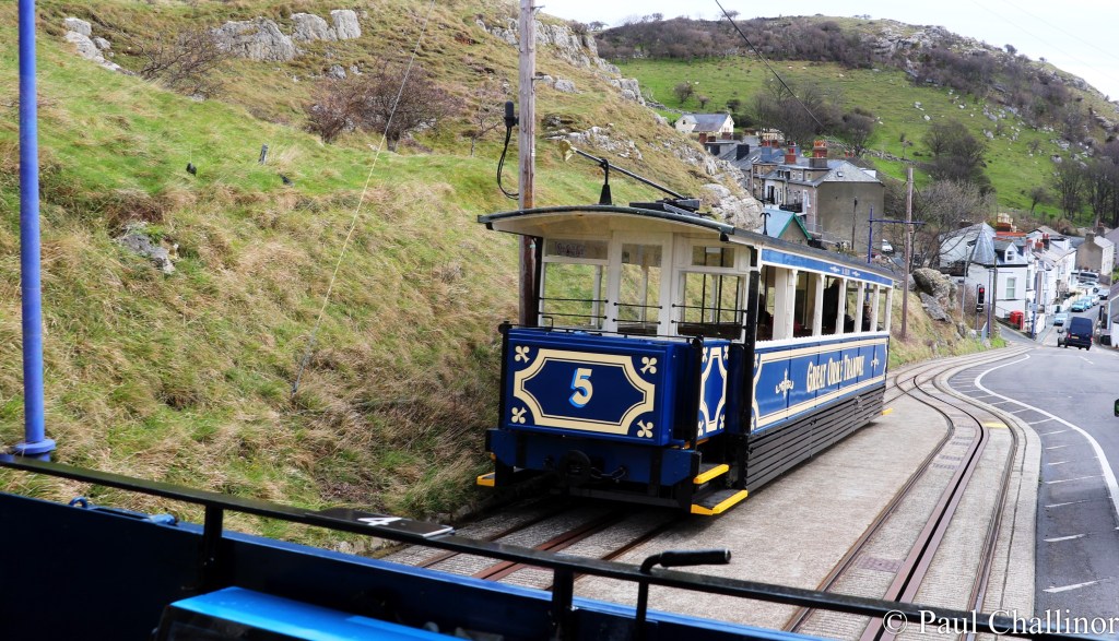 We caught the tram from Llandudno Victoria Station to just below the summit of the Great Orme headland. Operation of the tramway differs from the better-known San Francisco system in that it is not a cable car but a rather on the funicular principle, where the cars are permanently fixed to the cable, and are stopped and started by stopping and starting the cable. As one car is ascending, the other is descending, and they meet midway.