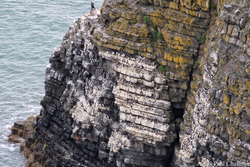 We came back the next day to a different climate. the sun was shining, all be it behind the clouds most of the time, so we decided to follow the coastal path south towards Birds Rock. We had been told the chances of seeing the Dolphins from the cliff tops were very good. As I mentioned in other posts, one of our ambitions is to walk the coastal path from end to end, but at the rate we are going it will take us another 25 years, 2 months and 3 days to complete it. So after a refreshing walk we arrived at the observatory and settled down to wait for the show to begin. It seems nobody had informed the Dolphins that we were waiting. No show. But we had some cracking views of the guillemots on their nests. The geology of the cliffs has created a series of shelves a couple hundred feet high giving the sense of a high rise block of flats.