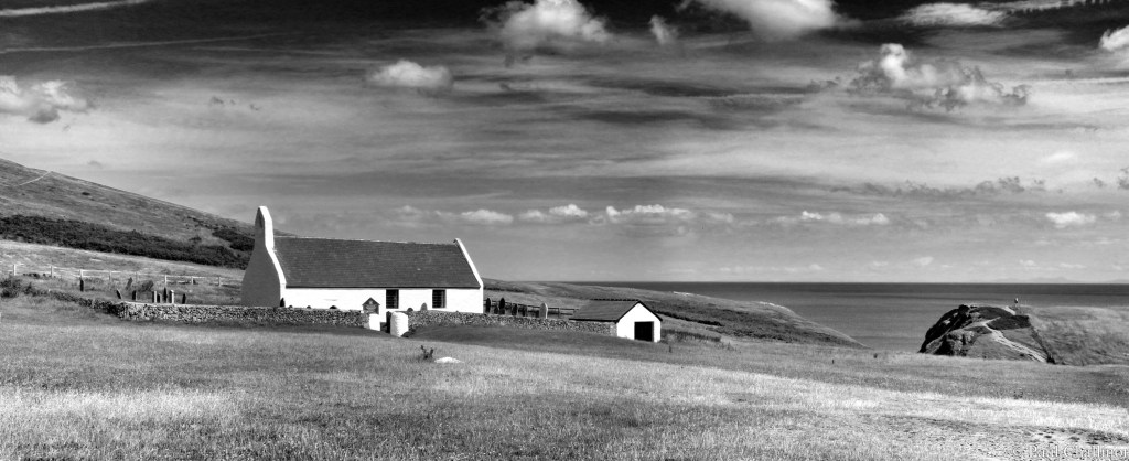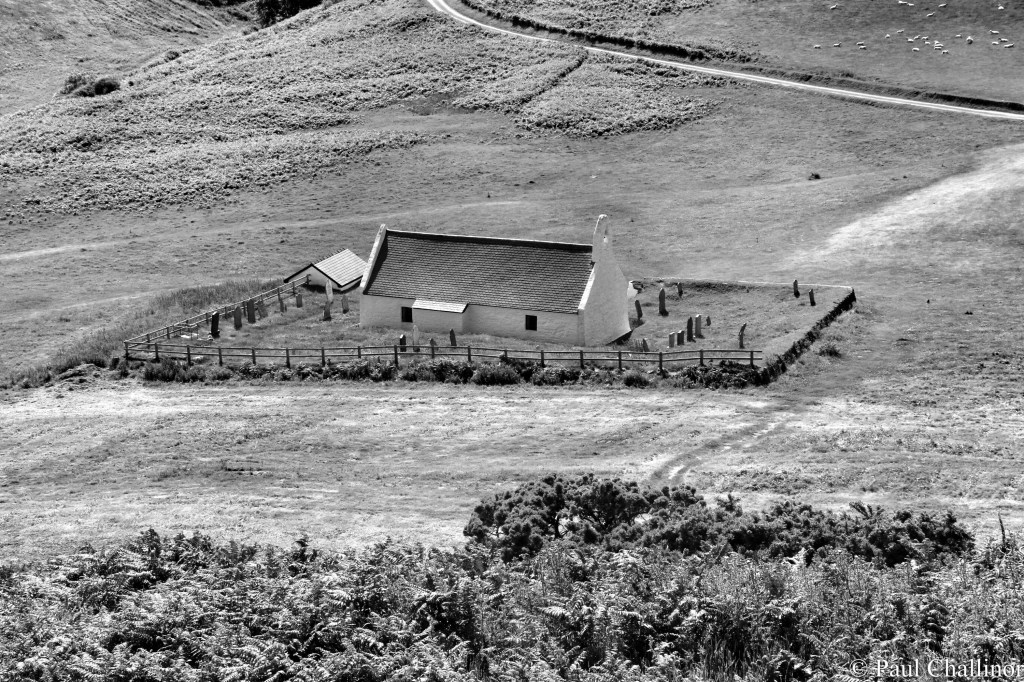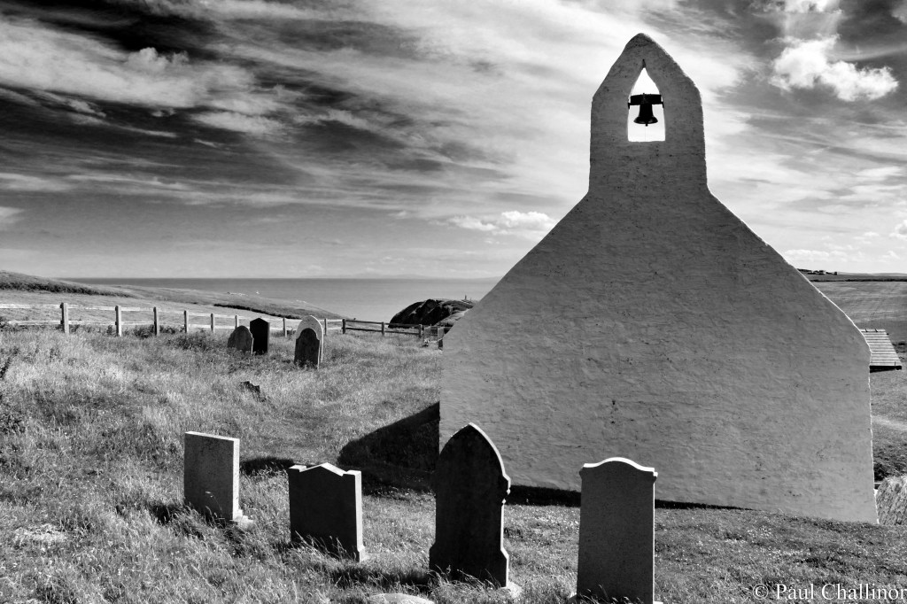 At the end of the lane is a sight worth waiting for. A small, white washed church squats at the top of the cliff, it’s low walls and simple bell tower clinging seemingly sunk into the ground to protect it from the winter gales that lash the west coast of Wales.
