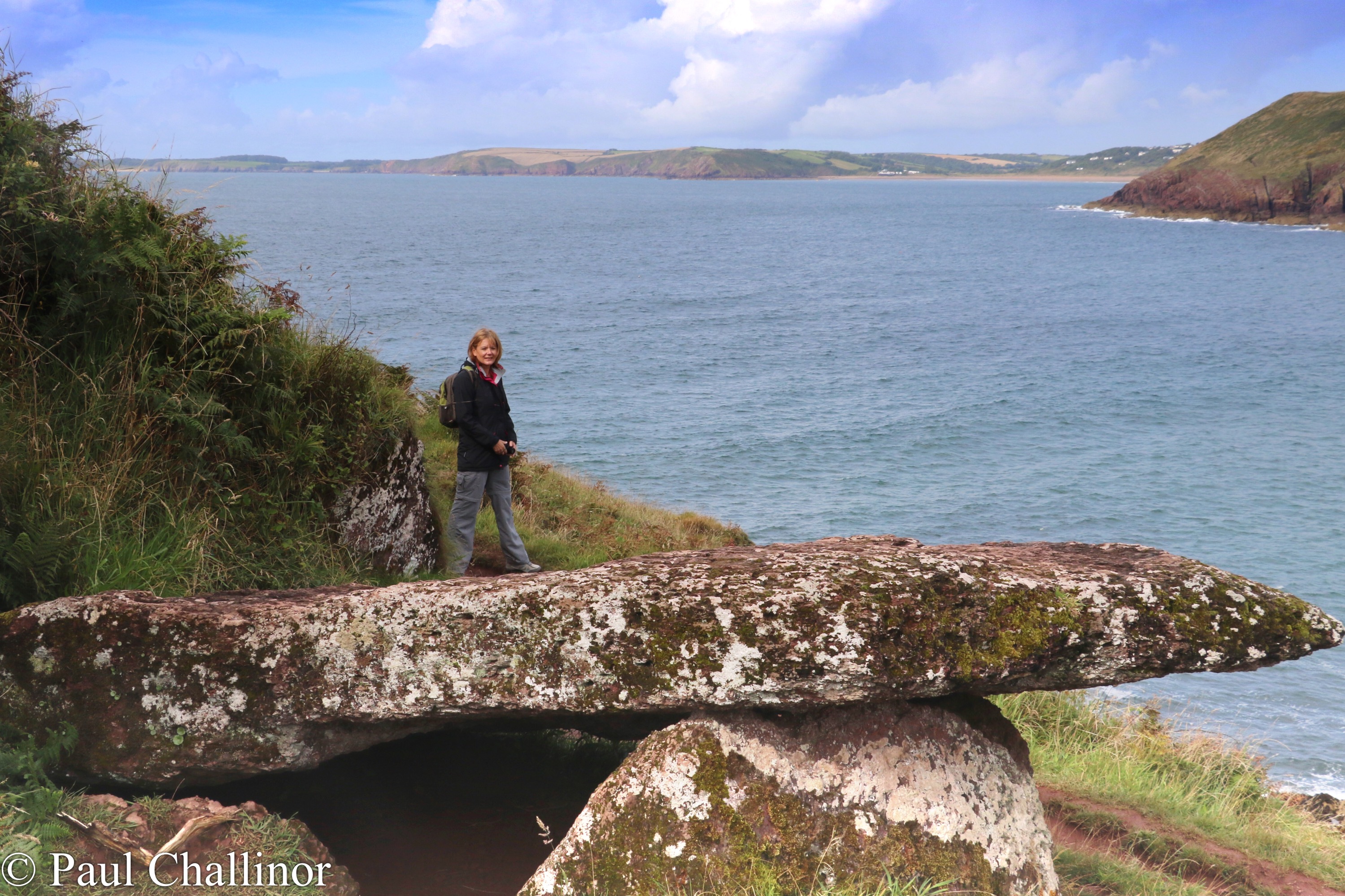 Just around the corner and within sight of Manorbier is a Neolithic burial chamber, named locally as Kings Quoit. This is a simple chamber with the large capstone resting on two upright ortholiths at the front, and the rear of the capstone on the ground. Unusually it’s not set on the ridge, but lower down the slope, so it’s not immediately obvious. I sure that when it was built the outlook around the bay would have been different, but wpeven so it’s a great site to contemplate.