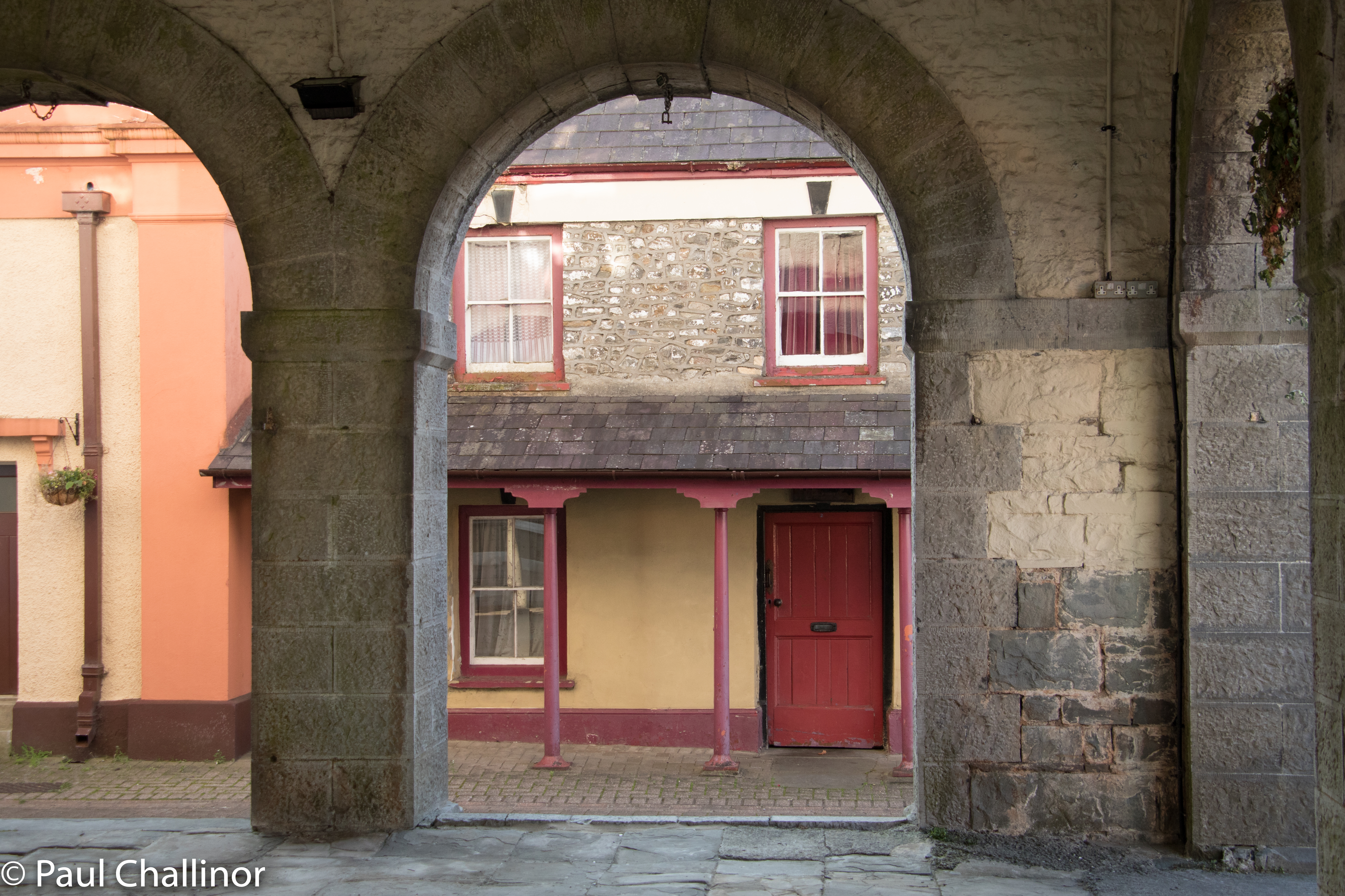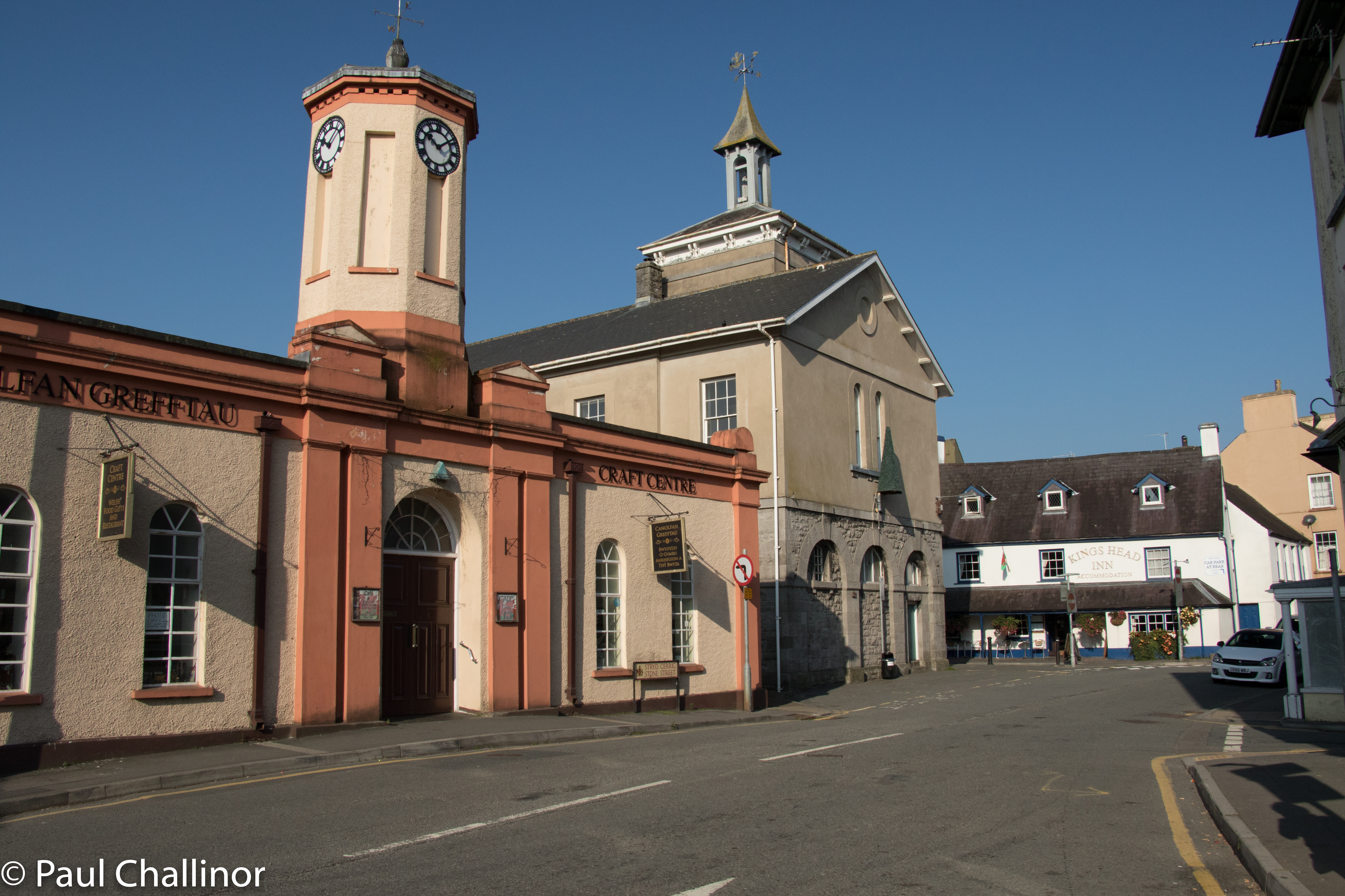 The Town Hall (1857-8) was designed by the architect Richard Kyke Penson. It fairly unusual for Wales, which tend to have very functional artitectrure. It has a courtroom over an open market, in an Italianate style. The building has two storeys with open arcades.