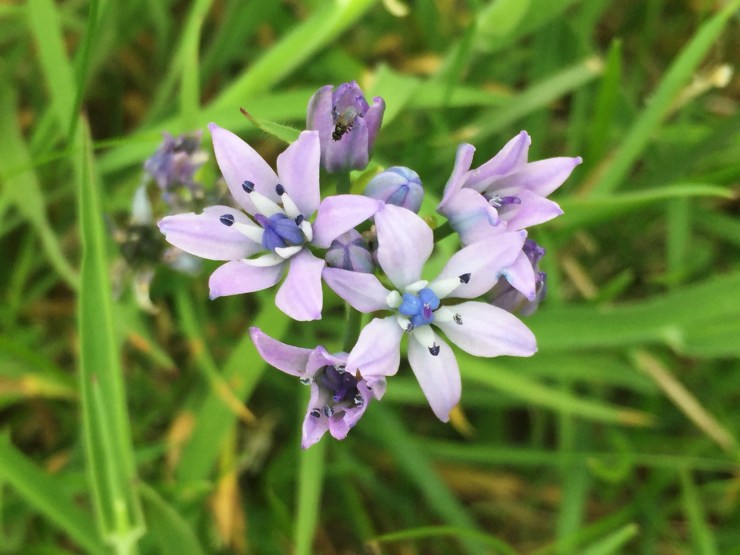 dotted around the island hidden amongst the growing grass are small clumps of Spring Squill, Scilla verna