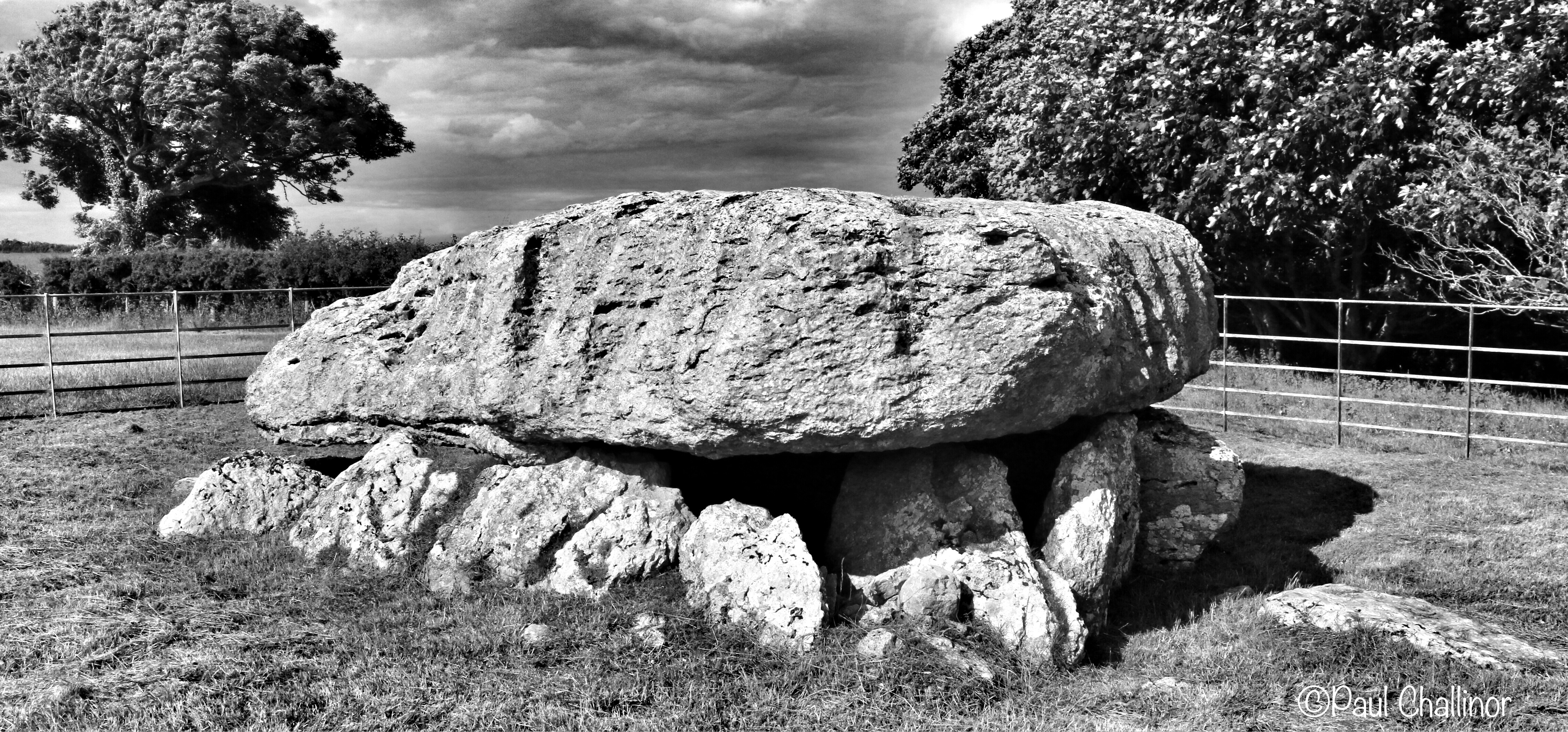 Neolithic megalithic tomb chamber, comprising eight stones of differing shapes, all supporting a massive capstone, 5.9m by 5.2m and 1.1m thick. The capstone is estimated to weight 25 tons. The tome constructed over a natural fissure in the rock so that the chamber had a height of about 2.0m. The shear size of the capstone and the fact that it is built over the fissure gives the tomb a squat appearance. There is no trace of the original cairn, although over the centuries soil has crept up around the stones. The chamber was excavated in 1909, when two layers of deposits were recorded, separated by a layer of paving. The deposits contained unburnt bone, human and animal, pot sherds and some flints and the upper deposit was covered by a layer of limpet shells. Between fifteen and thirty individuals were represented in the tomb chamber. Some of the pottery appears to be Bronze Age and at least one of the layers may represent the re-use of the tomb (1).