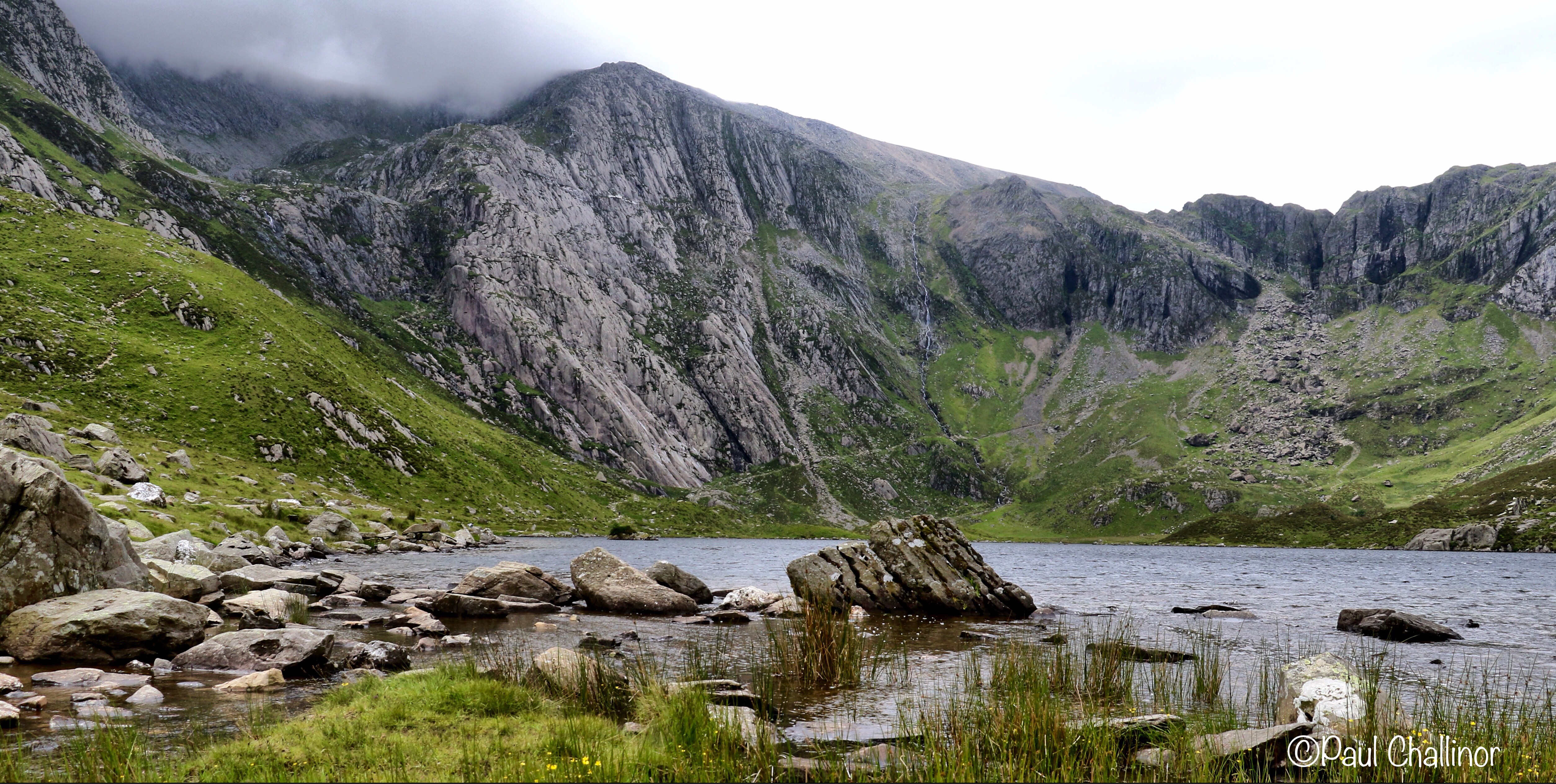 As we walked up the steep slope from Llyn Ogwen across the boggy areas the cloud started to descend over Tryfan and Glyder Fach and Glyder Fawr. I hoped this would lift, but as we topped the first ridge onto Llyn Bochlwyd, the cloud thickened and the peaks disappeared into grey, unwelcoming nothingness, indistinguishable from the sky. I’m old enough now to ask it is worth climbing up there and see nothing. And the answer is usually no. Aunty didn’t fancy it either, so we decided on another plan, and walked around the base of Glyder Fawr and then down to Llyn Idwal. Today was not a day for summits, but more for moody lakes and a surprising amount of wild flowers. The area was covered in Bog Asphodel, the yellow flowers lighting up an otherwise drab landscape.