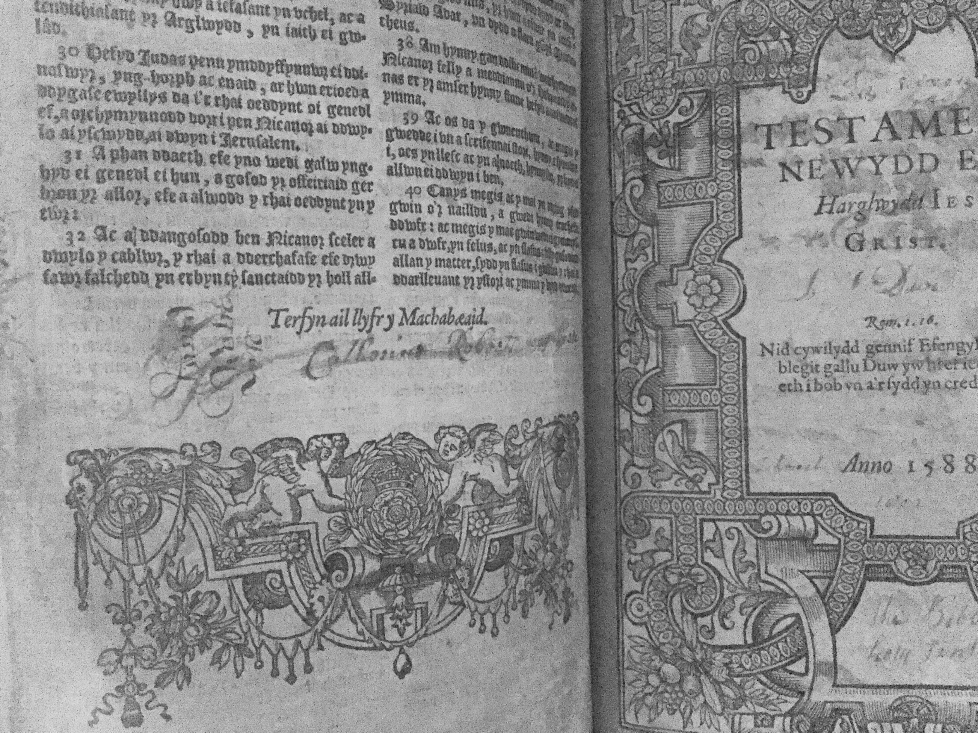 A handsome memorial stands in the Cathedral grounds dedicated to those instrumental in translating the Bible into Welsh during the 16th century. Today all Welsh schoolchildren will know about William Morgan (later to become Bishop of St. Asaph from 1601 to 1604) who took a crucial part in ensuring the survival of the written Welsh language. In 1563 an Act of Parliament was passed allowing the translation of the Bible and the Book of Prayer into Welsh “because the English tongue is not understood of the most and greatest number of all her majesty’s most living and obedient subject inhabiting Wales”. This shows that it was the vitality of the Welsh language, not its weakness which called for a Welsh Bible. The New Testament and Book of Common Prayer had been translated and published by Bishop Richard Davies and Williams Salesbury had translated and published the New Testament and Book of Common Prayer. However, by 1578, Davies and Salesbury had fallen out over their work and William Morgan, by now Rector of Llanrhaeadr-ym-Mochnant in the Tanat Valley, was encouraged to undertake the work by the Bishops of St. Asaph and Bangor. In 1587 he went to London to supervise the printing of the first Welsh Bible. This consisted of his own translation of the Old Testament and a revised version of Salesbury’s New Testament. The cost of publishing was paid for by Archbishop Whitgift, the Archbishop of Canterbury.