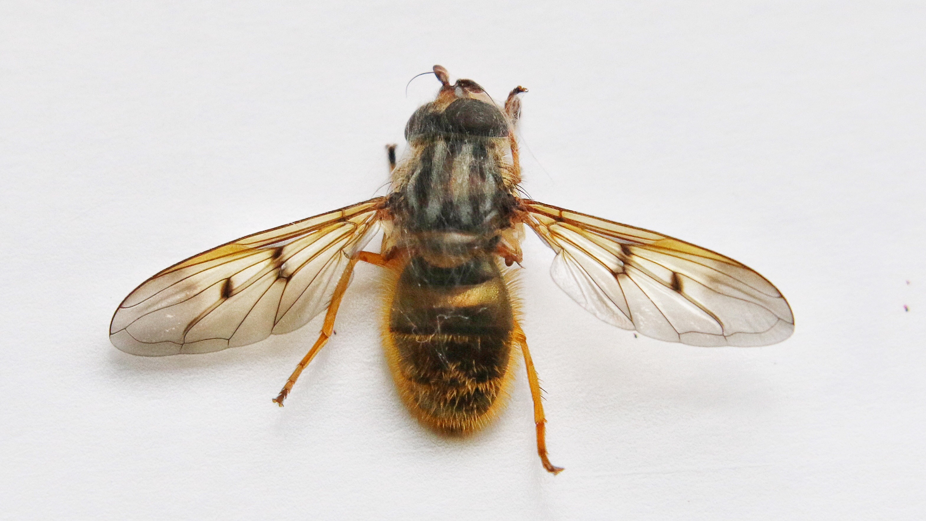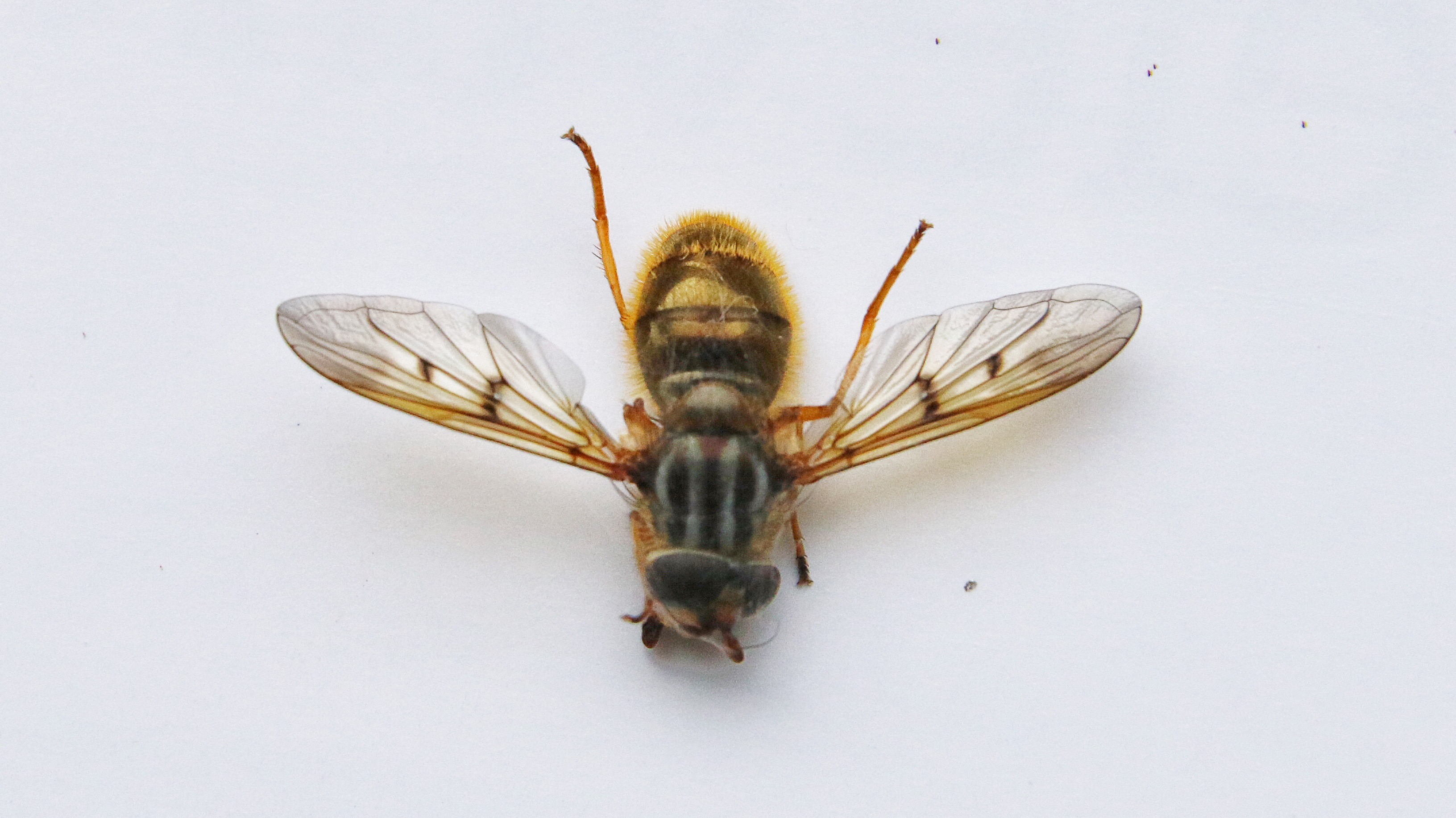 This specimen was already dead when I found it so it was able to pose nicely for the camera. Therefore it was easy to achieve a half decent photo and it shows up the brassy colour of the abdomen and neatly illustrates how hairy these creatures are. But for me the real beauty is in the detail of the wings. The yellow/brassy ting to the leading edge of the wings, and the distinct stigmata.