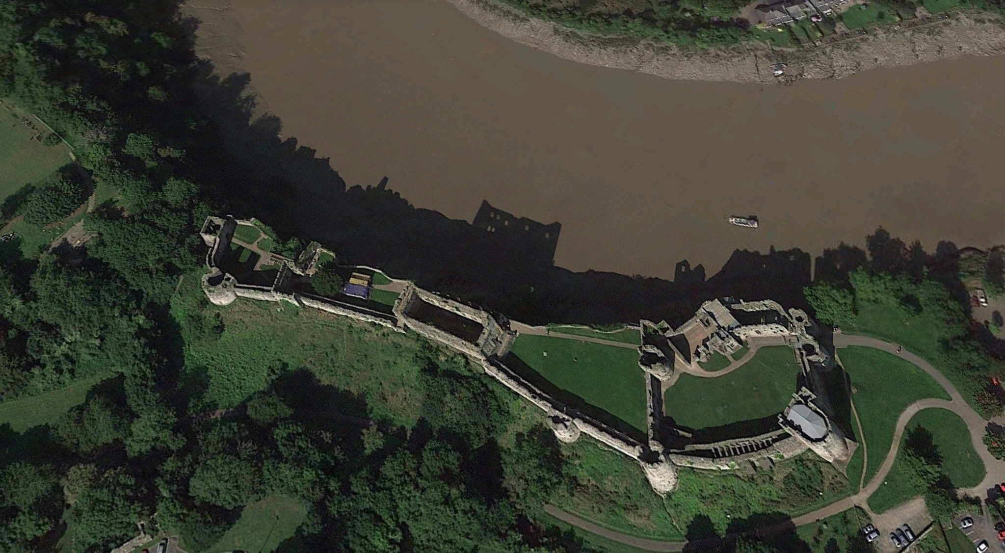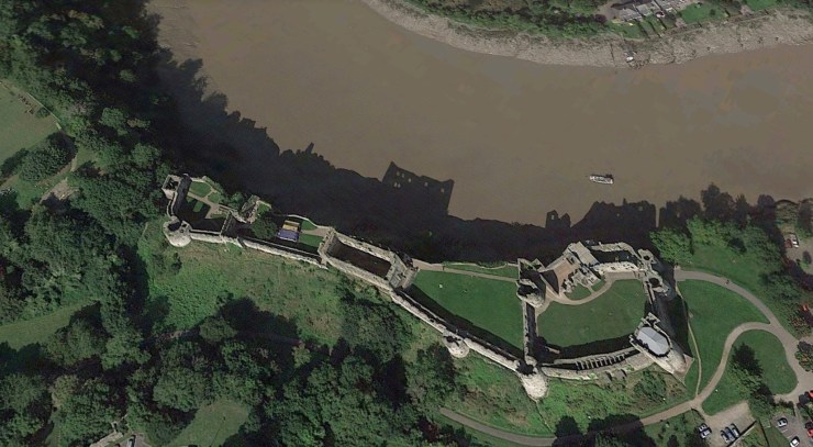 The castle isn’t your usual square fortification that kids draw with towers at each corner. It occupies a long, narrow ridge on the southern bank of the River Wye and is separated from the town by a deep gully known as ‘the Dingle’. It was enlarged and refortified a number of times over the years by some of the most powerful men of their times. The image from Google Earth shows how it follows the cliff and the Wye on one side with much higher and stronger walls on the landward side. The walls on the river side have large windows, even then then Lords and Ladies liked a good view. Though on the town sides the walls are bereft of windows and only arrow slits are visible.