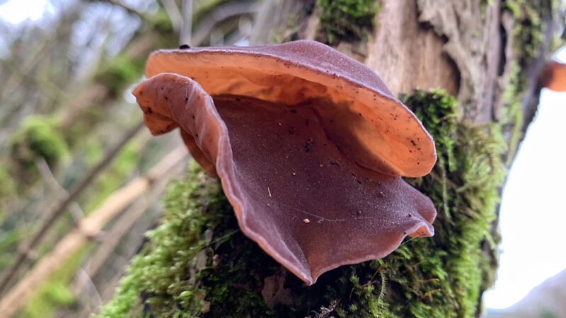 Along the walk we found a number of different fungi, one of which is called Jelly Ear, Auricularia auricula-judae. This flexible and jelly like fungus is mainly found during winter and spring. Often growing on on dead elder trees and on fallen branches, it occasionally grows on other kinds of hardwood. At times it does look like an ear, and it has a very jelly like feel and texture. Apparently it can be eaten, but doesn’t seem to offer much to the culinary experience. It’s certainly not one I’d try.