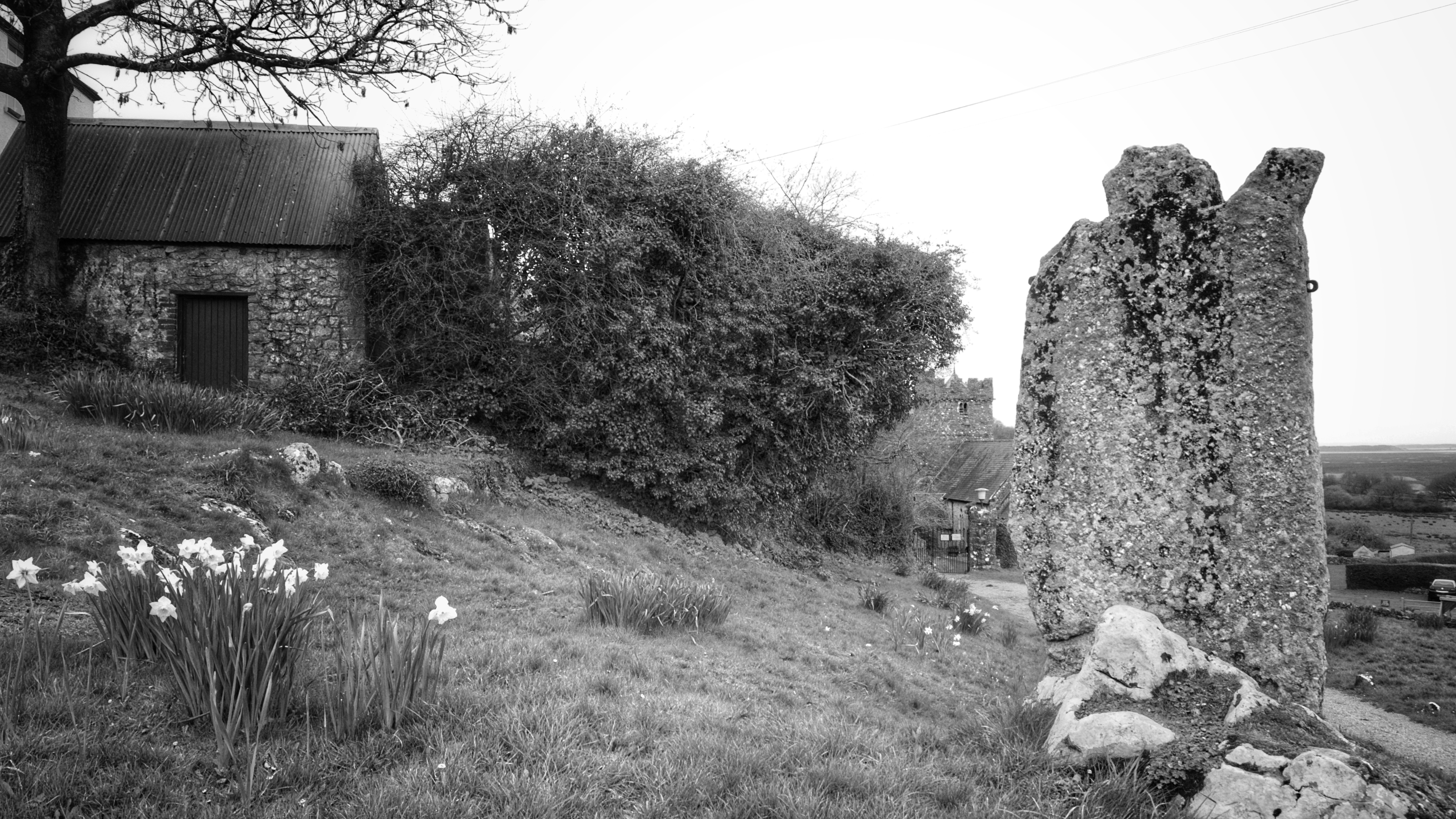 A couple of miles further along we reached Llanrhidian, a pretty village with narrow roads and a lot to interest a geek like me. But Aunty only allowed me a quick look at a couple fo standing stones and the hope to see the Leper Stone. However, the Leper Stone is kept in the church porch and the door was locked – another day maybe. But the two stones are difficult to miss. The larger one was once a Celtic Cross, and it is just possible to see the spokes where the circular section once was. There are also a couple fo metal rods sticking out of the top and it was once used as a pillory. the smaller stone has been recorded in the Parish Records as being raised being raised by 10-20 volunteers to its present position on 8th April 1884. Each of them being rewarded with a pint of beer in the Welcome to Town pub opposite.