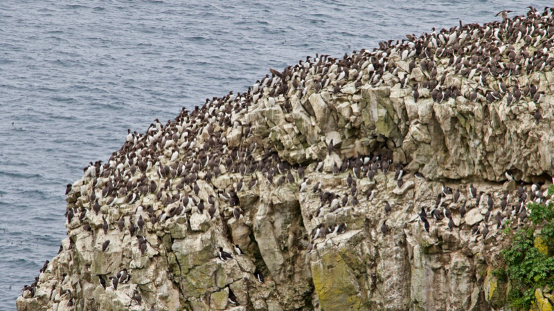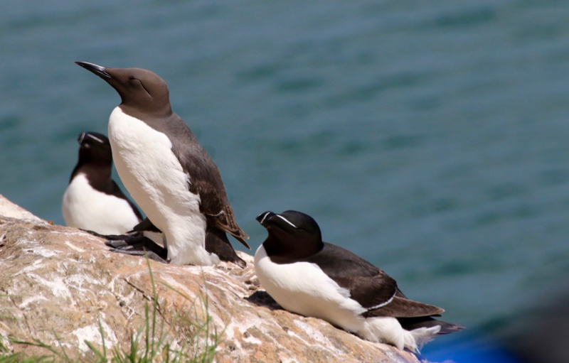 When I say there were a lot, I mean a lot. Every conceivable legged had a bird nesting, and I’m not sure some of these could even be termed ledges they seemed so narrow. The tightly-packed colonies are known as “loomeries”, and the eggs are laid on the bare rock ledges or ground. The shear mass of birds provides protection for the eggs and chicks from the aggressive Lesser and Greater Blackbacked Gulls which given any opportunity will swoop in and take an unguarded egg or chick. It could be argued that the Guillemot has perhaps the smallest nesting territory of any British bird. It’s been estimated to being only extending a beak length round its nest, about 5cm.