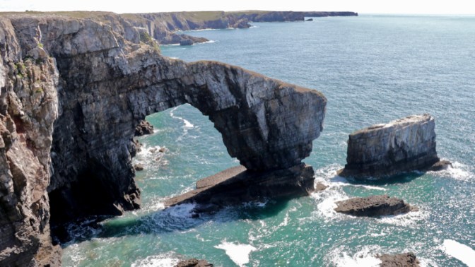 Eventually the arch will collapse and leave two stacks similar to the Elegug Rocks about 100 meters east. In the spring and early summer these stacks are ram packed with thousands of nesting sea birds, razorbills, guillemots, fulmars and cormorants. As you approach the cliff edge if the wind is in the right direction, you can smell the birds before you see them. Stack Rocks are named after the guillemots, which in old Welsh were known as elegug.