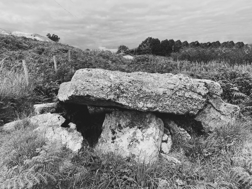 As you approach the the first tomb nestled amongst the Bracken and brambles you notice how low it is. The massive capstone is supported on three sides by low stones and on the fourth it is resting directly on the ground giving it a tilt or slope. It’s only about a metre or so high and it is open to the west. To get inside you’d have to get on all fours and crawl, which may have been necessary as part of the ritual for which these tombs were designed. The second two seems to be smaller but has been built very similar, with three supporting side stones and the Large capstone resting on the floor on the fourth side. there is only one stone supporting the capstone on the 3rd to, with the others possibly have already fallen during the 4000 years since been built. There is some controversy about whether each term would have been covered with a mound but it is not absolutely clear. However there is a suggestion in some of the latest research at the tunes were always designed to have the capstone visible when they were still in use before their final closure.