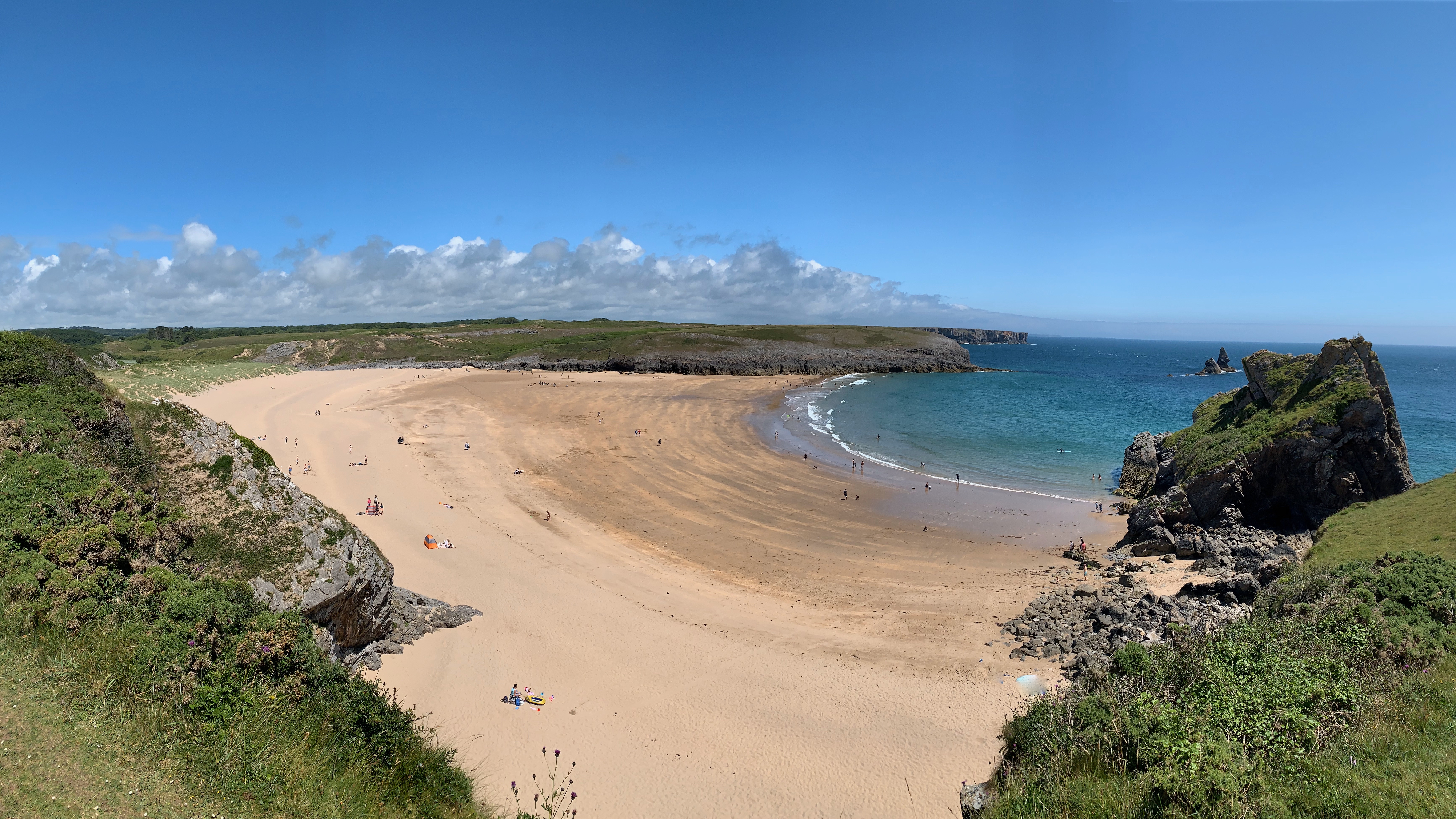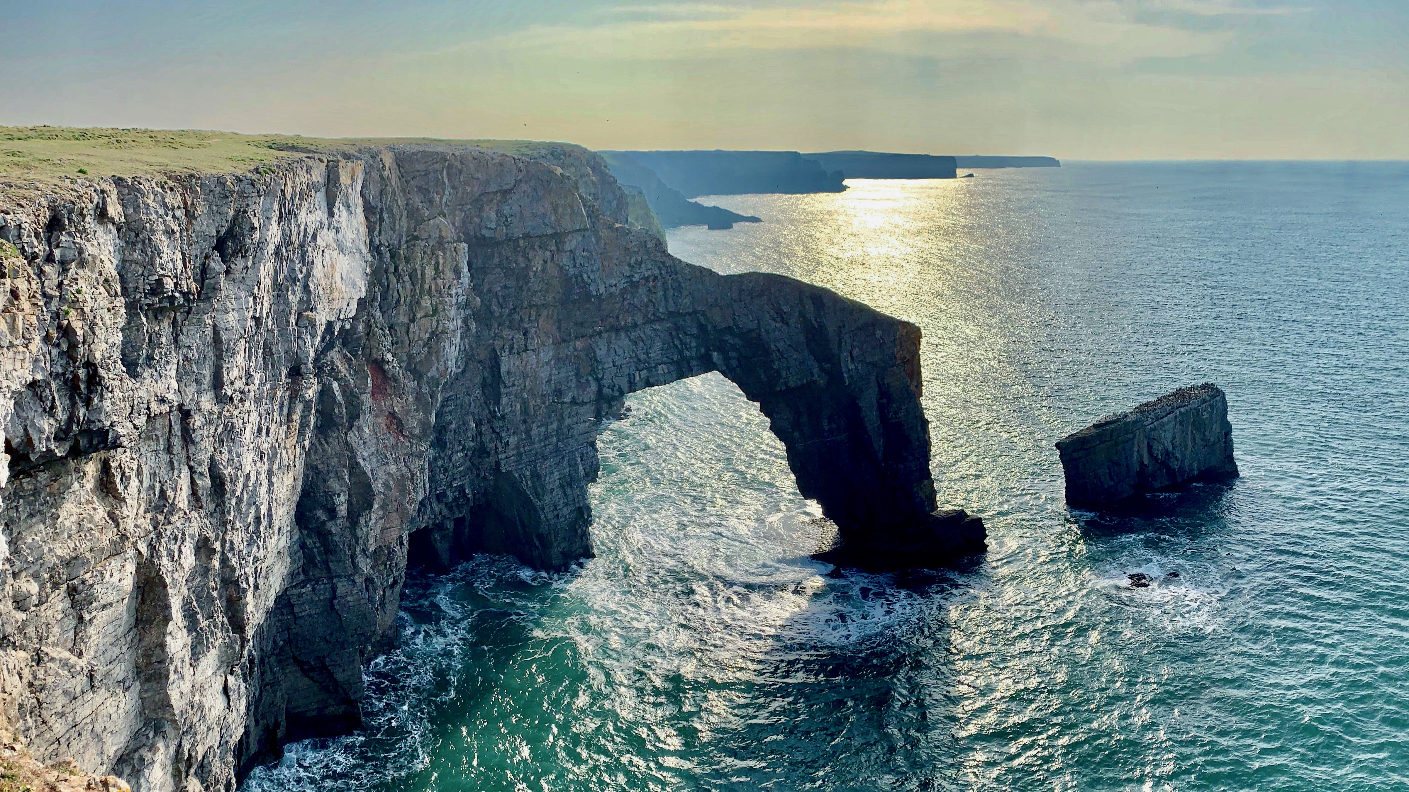 If you are not walking the Wales Coastal Path there are a couple of reasons for coming this way. One is to see the Green Bridge of Wales, a large natural arch carved out of the limestone cliffs. But another reason for coming this way at this time of year is to looking wonder at the Elegug Stacks, which create a wondrous sight with thousands of guillemots nesting along the sheer cliff sides. Every possible ledge was occupied by these beautiful black and white auks. We stayed a while having coffee watching the constant activity of arrivals and departures as the parents left to hunt and return with food for the young. How on earth they know which ledge to head for is beyond my understanding. We could have sat there for ages, but the walk needed to be completed and we have a few more miles to cover.