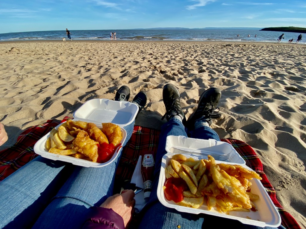 We did start to get a little worried thinking the next announcement would be “No more fish!”. Now that would have been a disaster. As it turned out, it was close, but we finally got our fish and chips. Then is was down the beach and munch time could start, and after queueing for 30 minutes I was more than ready. Out came the picnic blanket, a cup of tea and we were set.
