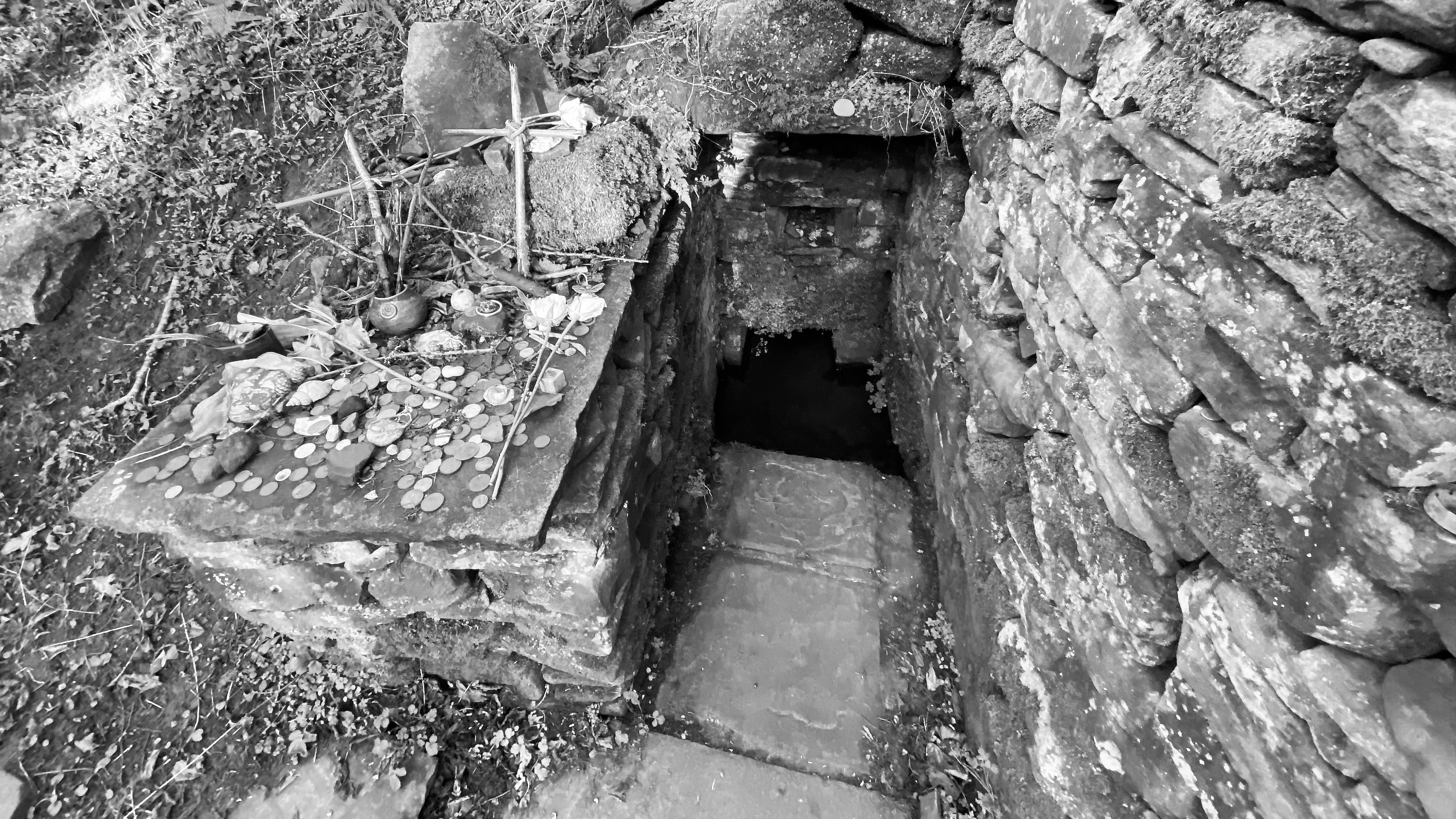 Tucked down off the road near a sharp bend, and just above the Nant Mair Ffynnon Issui is one of the better preserved wells I come across in a while. Steps lead down from the road to a small dry stone alter enclosing a square basin which collects water running down from a stream in the bank. Today the area is a quiet close off valley hosting a number of ancient farms, but despite this Ffynnon Issui seems to be visited quite often judging by the number of votive offerings on the top of the stone walls. These range from flowers, to sea shells (we’re a long way from the sea here) and lots of coins. Ffynnon Issui is certainly not a place you pass by on the way to somewhere else. You need towing to come here.