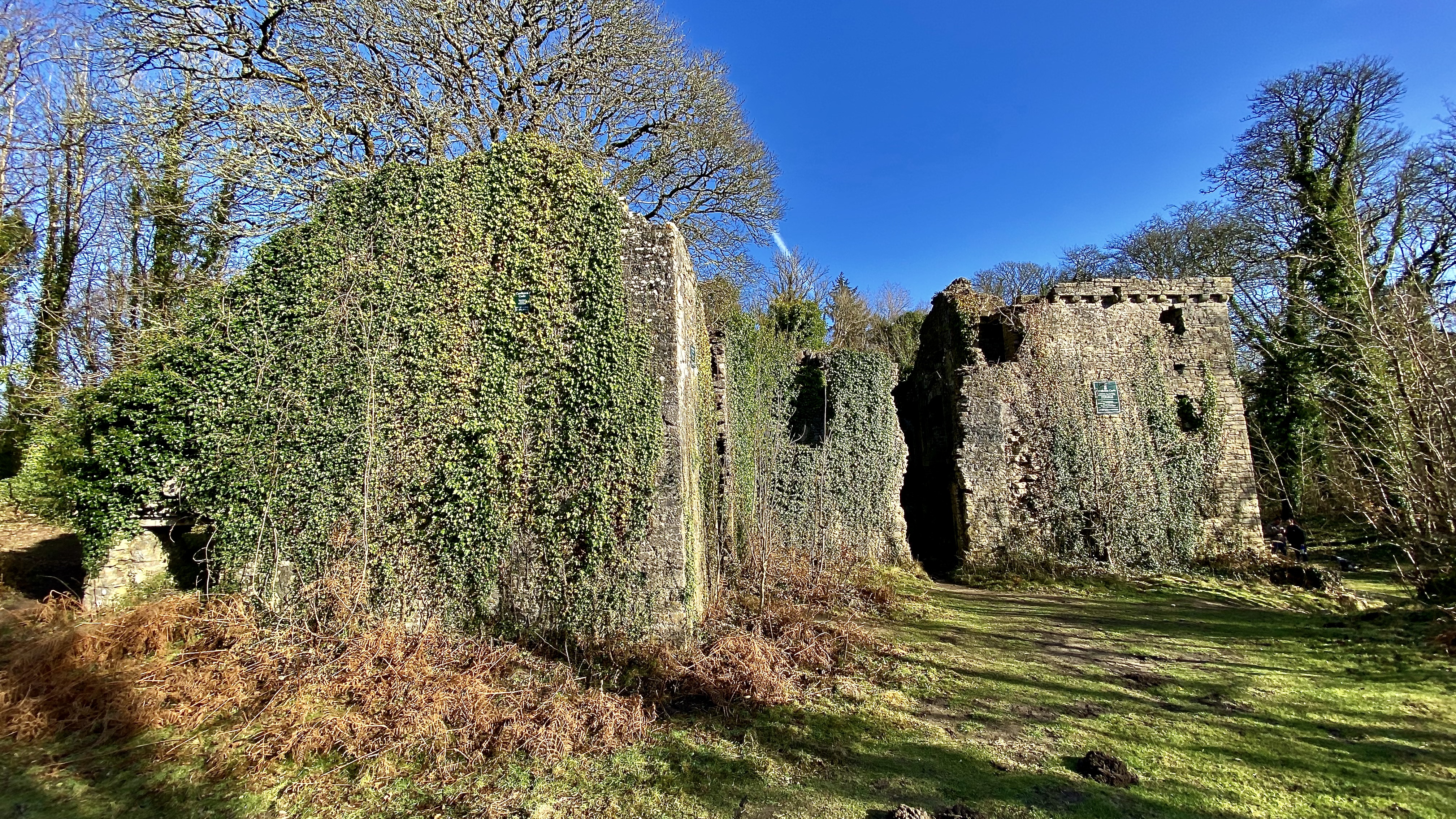There can’t be many places in the UK where you can look down on a Norman castle from the top of a sand dune. You’ll have to look closely at the main photo above to see the castle among the trees. Candleston Castle may not be a major fortress, but as a fortified manor house is was still at the mercy of natural forces rather than pissed off Welshmen. When it was first built in the 14th century the outlook would have been very different from today as it huddles at the foot of a ridiculously high sand dune. So large in fact it has its own name – Twmpath Mawr. Although the landscape has altered it is thought it would have been built upon a promontory of land overlooking the Merthyr Mawr sand dunes and it is probable that there was originally a small harbour near the site. All that’s left today are the walls of the main house and partially surviving surrounding D shaped defensive walls.
