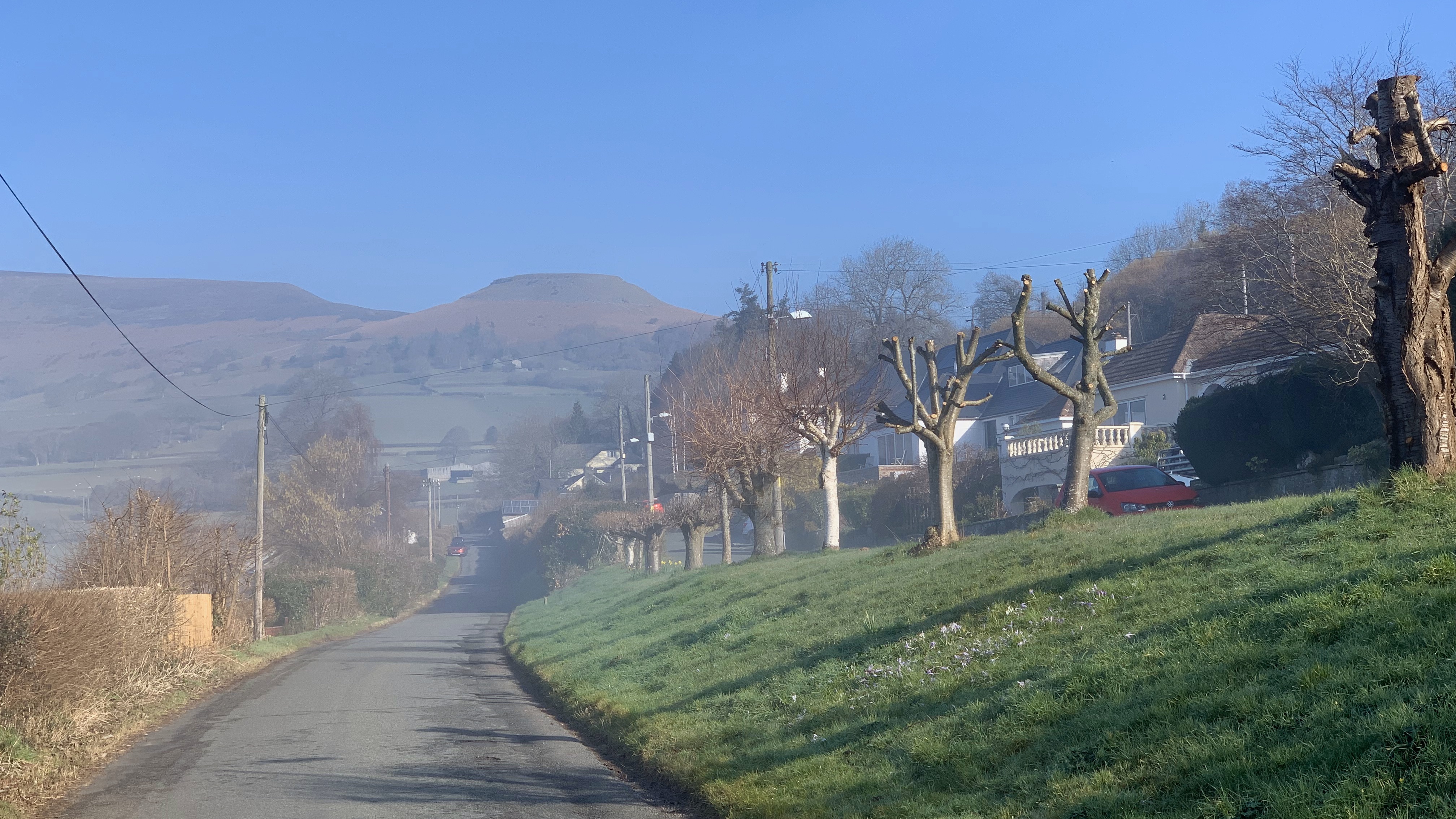 We starting driving from home through thick fog, and were not very optimistic it would lift. The closer we got the more pessimistic we became that we would get many views during our walk, especially as the fog thickened the closer we got to Crickhowell. But not to be deterred we left the car in the car park in the centre of town, however the surrounding hills were invisible. Climbing out of the town along Great Oak Road the fog started to thin and we spied the steep sides of Crug Hywel ahead, doing what it was intended to do, dominating the surrounding area. Named after Hywel Dda, one of the major Welsh kings from the early 10th Century Wales. However, the likelihood of Hywel Dda building here is uncertain. But what is certain is that this is an Iron Age fort, and therefore was built much earlier.