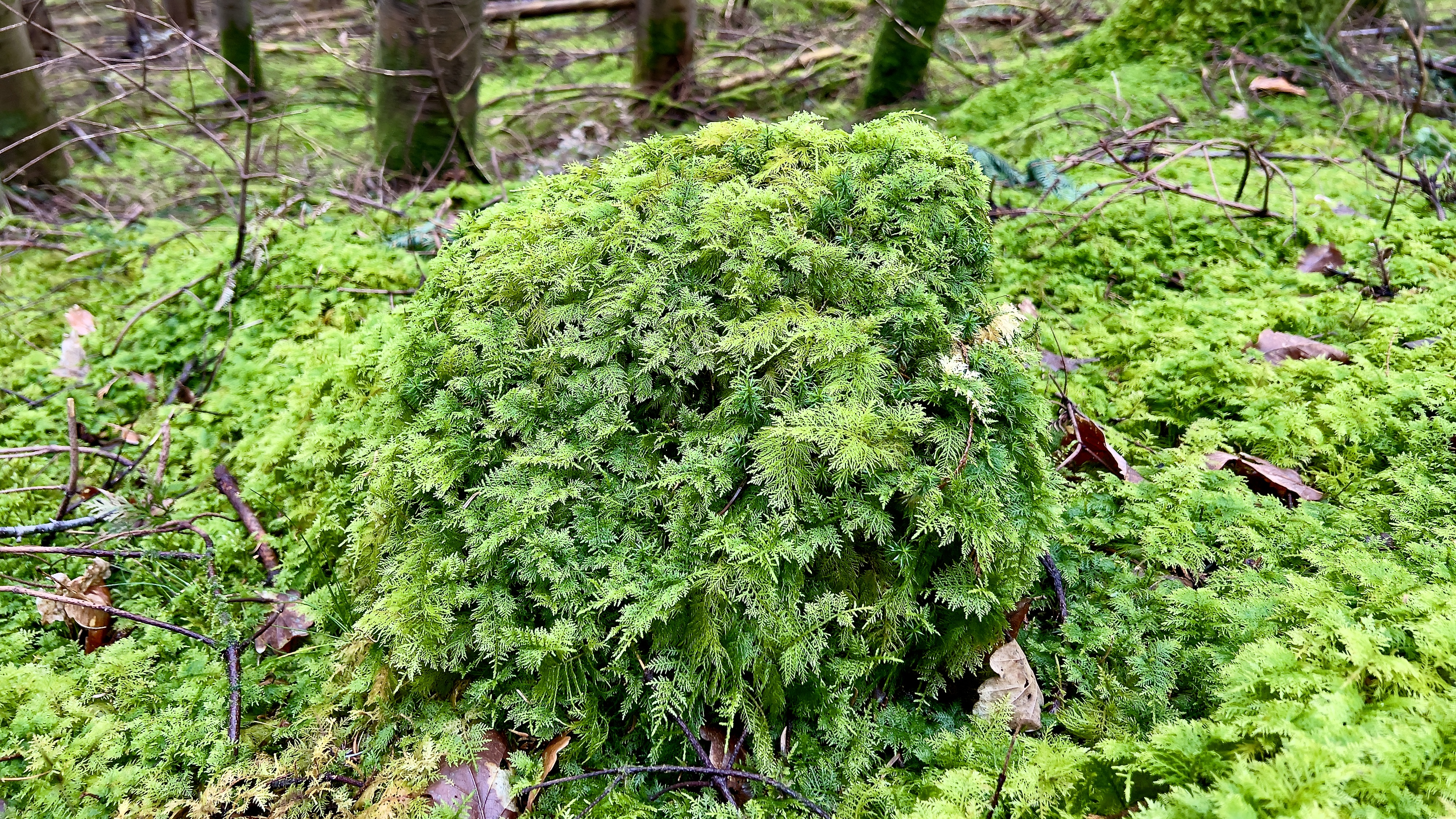 But what really sets the Welsh temperate rain forest apart is the amount of rainfall it receives. My ID skills with mosses is not very good, but I am beginning to recognise some of the more distinctive and common species. One of my favourites is the Common Tamarisk Moss (Thuidium tamariscinum). In places it has created a lush, thick green mat across the forest floor, creating small hummocks as it grows over felled tree trunks (you can read more here). Another common moss I came across was the intriguing named Slender Mouse-tail Moss growing up the tree trunks almost like green velvet trousers.