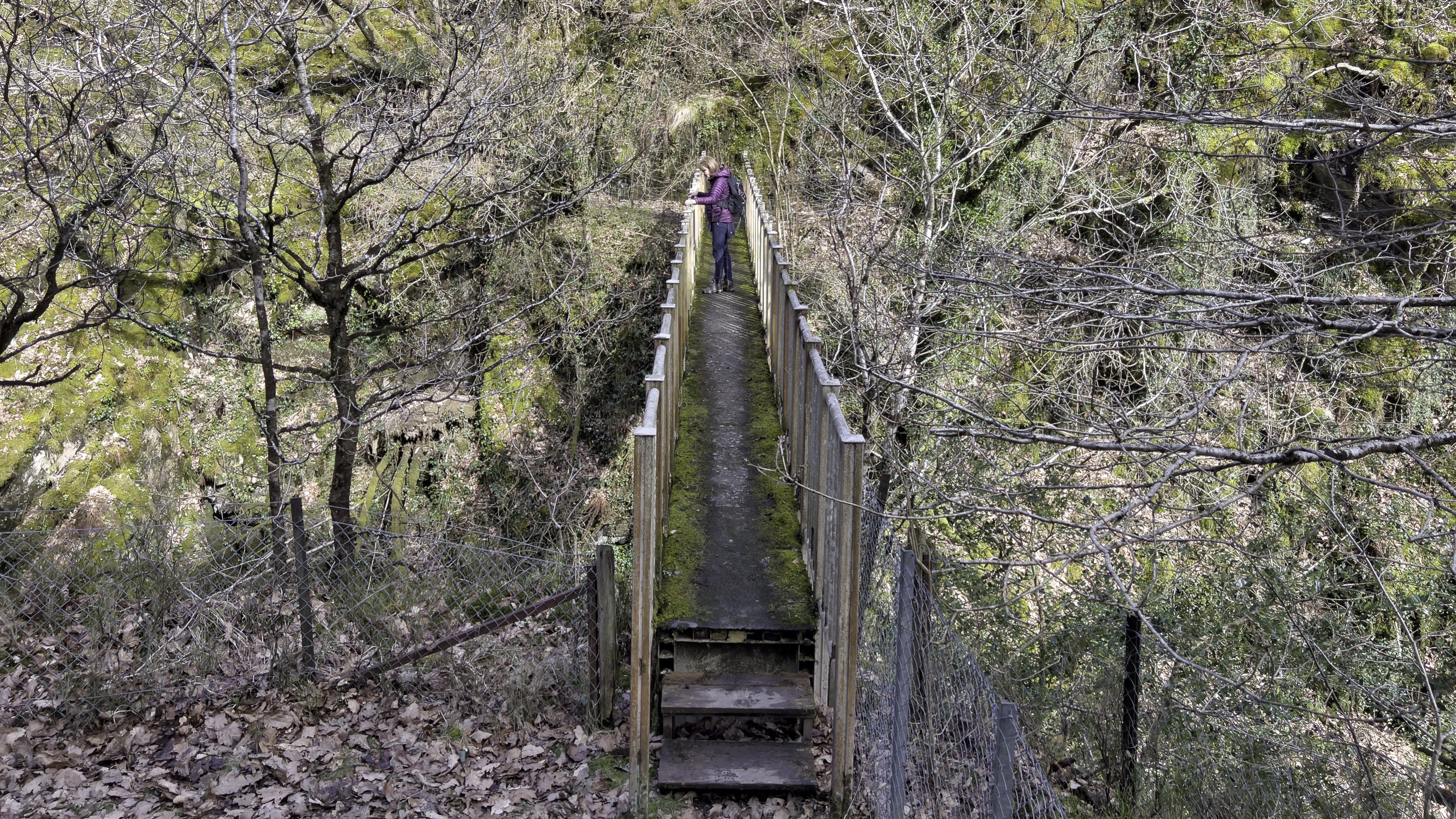 Over the years the bridge has been replaced many times, and up until 1951 the bridge was a single plank hung from the sides of the gorge by chains and sixpence a day danger money was paid to the man who maintained it. Over the years there have been a number of bridges with the current bridge is much more permanent and affords a view down the deep and narrow gorge to the dark peaty waters rushing past below. Just visible through the trees upstream are the remains of the disused Temple Mine, another of one of the lead mines which were operational until the early 1900’s.