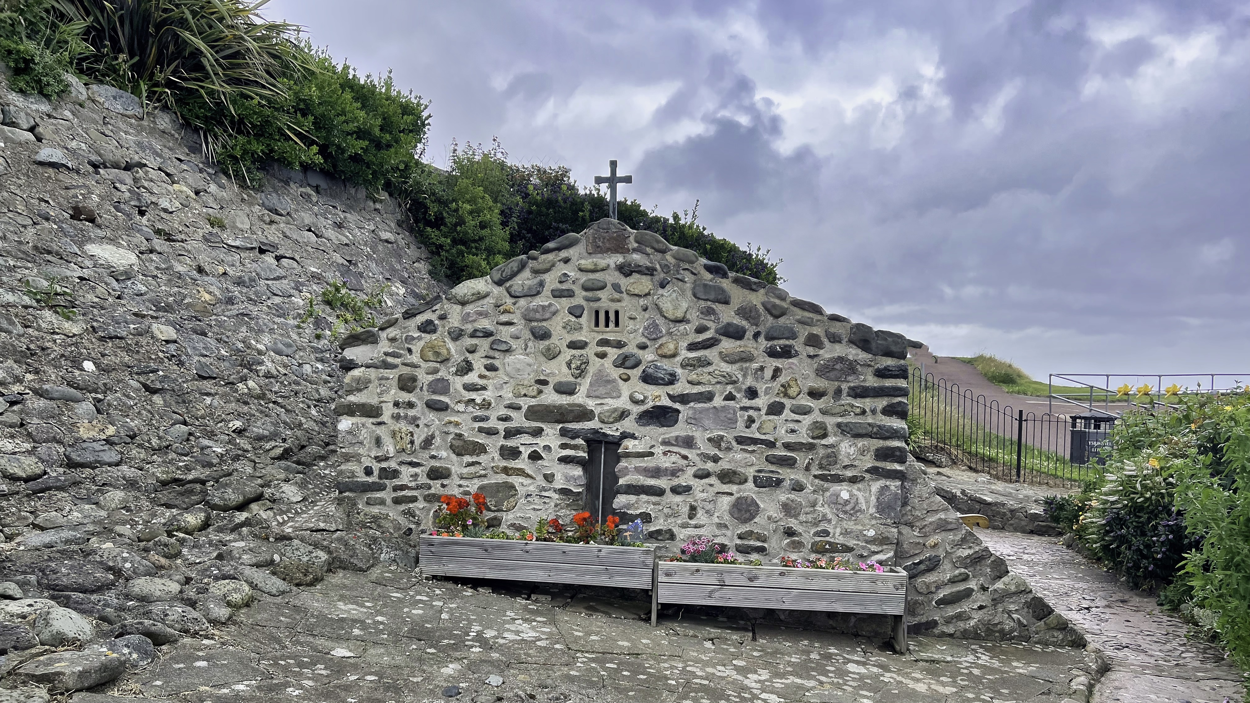 We almost missed the chapel while walking this stretch of the Wales Coast Path. If we had not diligently walked as close to the sea as we could and followed the wider promenade path higher up on our way to the cafe for lunch, then this gem would have been missed. Today it is completely dominated by the lower promenade and wide tarmac walkway with the wall supporting the upper promenade and road overshadowing this tiny building. The town of Rhos-on-Sea has grown above and around it, with only the sea immediately to its north to suggest its position here. In the 5th and 6th centuries there would have been very little population here on this exposed coast, but the sprig water that flows from the rocks here would have been valuable resource, and as such quite possibly an ancient sacred site.