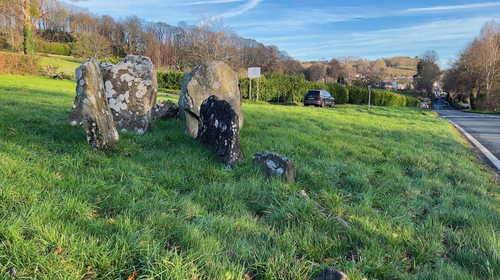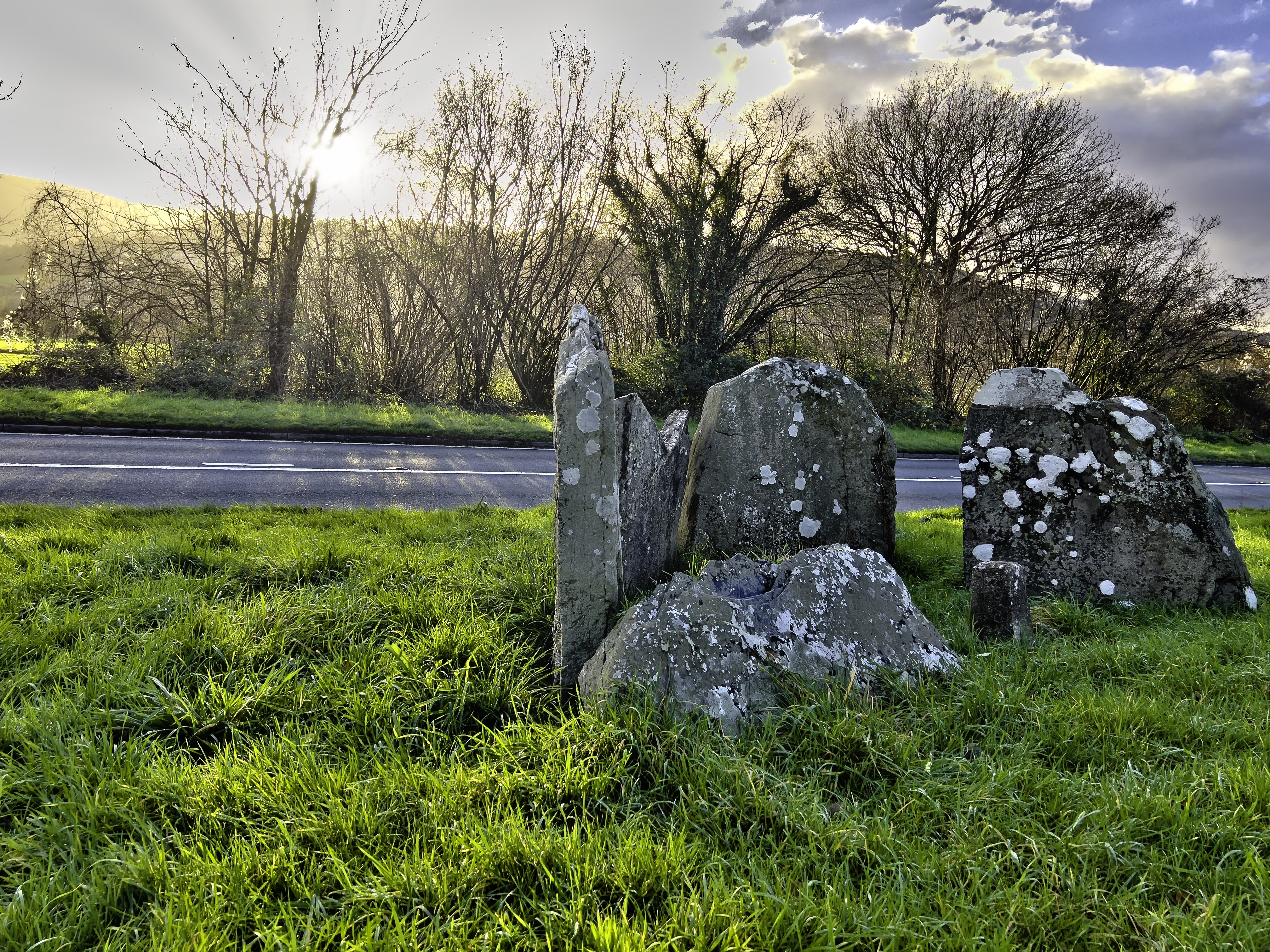 This neolithic chamber is not the dramatic, perfectly preserved monument you see shown on postcards of places like Pentre Ifan or even Tinkinswood, but that’s part of its charm. Right on the edge of the road all you’ll find is a truncated, weathered long cairn with a few upright stones (orthostats) poking through the turf. But these upright stones hint at a time when people shaped the landscape with enormous, communal acts of memory. Standing there, with the Usk valley dropping away and the Black Mountains sketching the skyline, you’re looking at a place that once held people’s dead, their rituals and their stories. Unfortunately these stories are long lost, and we can only use our imagination to guess what their lives and beliefs were.